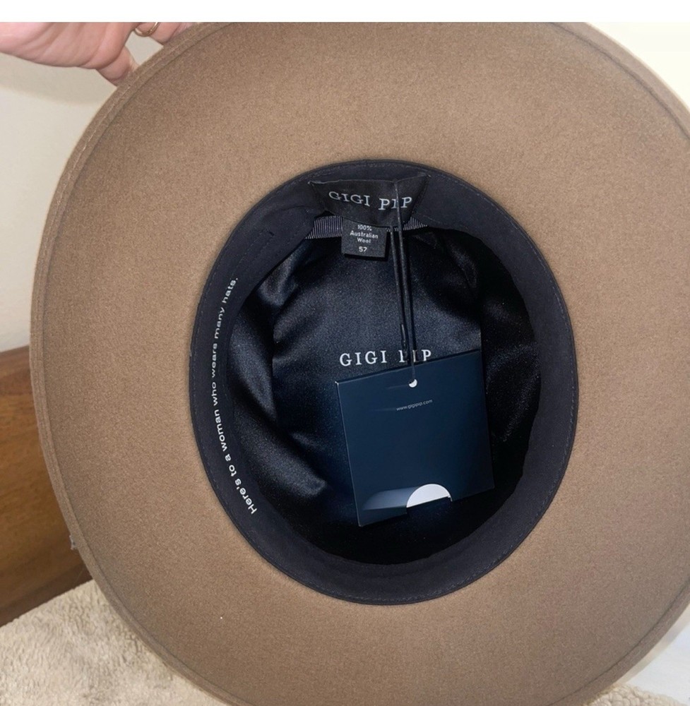 Features: Wide Brim Character: Gigi Size: 57 Brand: gigi pip Material: Wool Pattern: Solid Style: Fedora Personalize: No Vintage: No Model: Gigi Pip Country of Origin: China Fabric Type: Felt Handmade: No Department: Women Color: Brown Season: Spring, Fall Occasion: Casual
