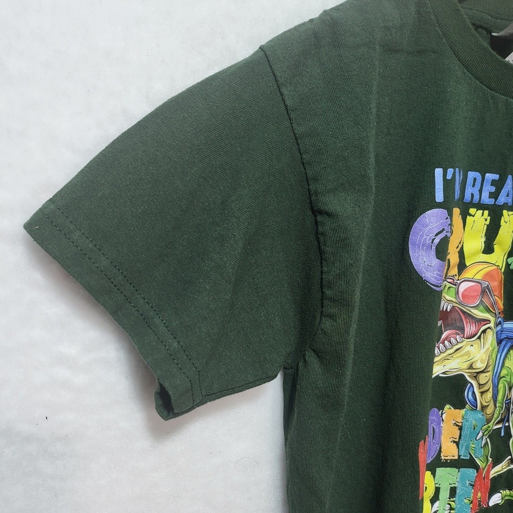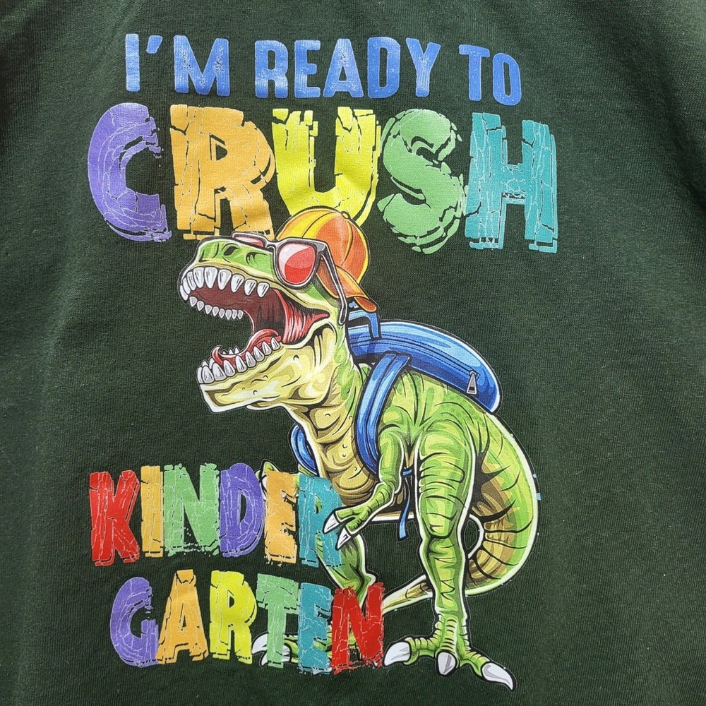 Classic crewneck t-shirt in a deep forest green features a vibrant graphic of a T-Rex wearing sunglasses and a backpack, ready for the first day of school. The colorful text reads "I'm Ready to Crush Kindergarten," making it an ideal choice for back-to-school photos or everyday wear. Constructed from heavy cotton for durability, this short-sleeve tee offers a comfortable fit for active kids. Measurements: • Length: 21.5" • Chest (pit to pit): 14" (28" doubled) • Sleeve Length: 5.5" Brand: Gildan Material: 100% Cotton Color: Green Pattern: Graphic Sleeve Length: Short Sleeve Neckline: Crew Neck Style: Graphic Tee Theme: School, Dinosaur Fit: Regular Character: T-Rex Occasion: Casual, School Season: All Seasons Keywords: Back to School, Kindergarten, Dinosaur, T-Rex, Boys Shirt, Graphic Tee, Forest Green, School Outfit, First Day of School, Kids Fashion, Animal Print, Educational, Fun Shirt • We ship within one business day. • Please compare the measurements to something you already own. Thank you for supporting our small business!