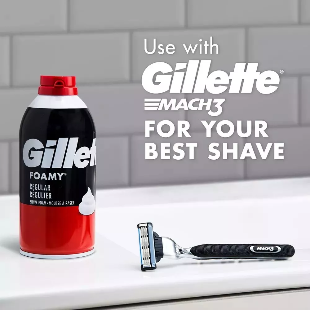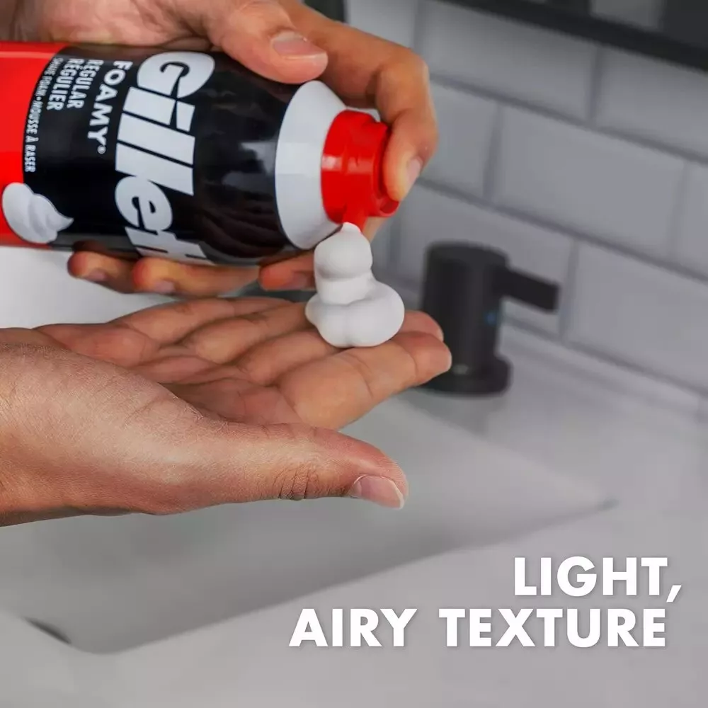 About this item CLASSIC PROTECTION: Helps protect your skin against shaving irritation, cuts, nicks, and stinging with Gillette's classic formula IT’S QUICK, EASY AND SMOOTH: Gillette Comfort Glide formula helps razors glide clean and fast for a shave with few tugs, pulls, friction and shaving irritation FOAMY, AIRY TEXTURE: Gillette's foamy, airy texture makes it easy to lather and rinse off with a smooth glide, ideal for the fast shave you want A GREAT DEAL: Gillette Foamy Mega Can can with 35% more foam WORLD'S #1 SHAVE AND FOAM BRAND: There's a reason Gillette's been around for 100 years, Gillette knows what men want in a shave