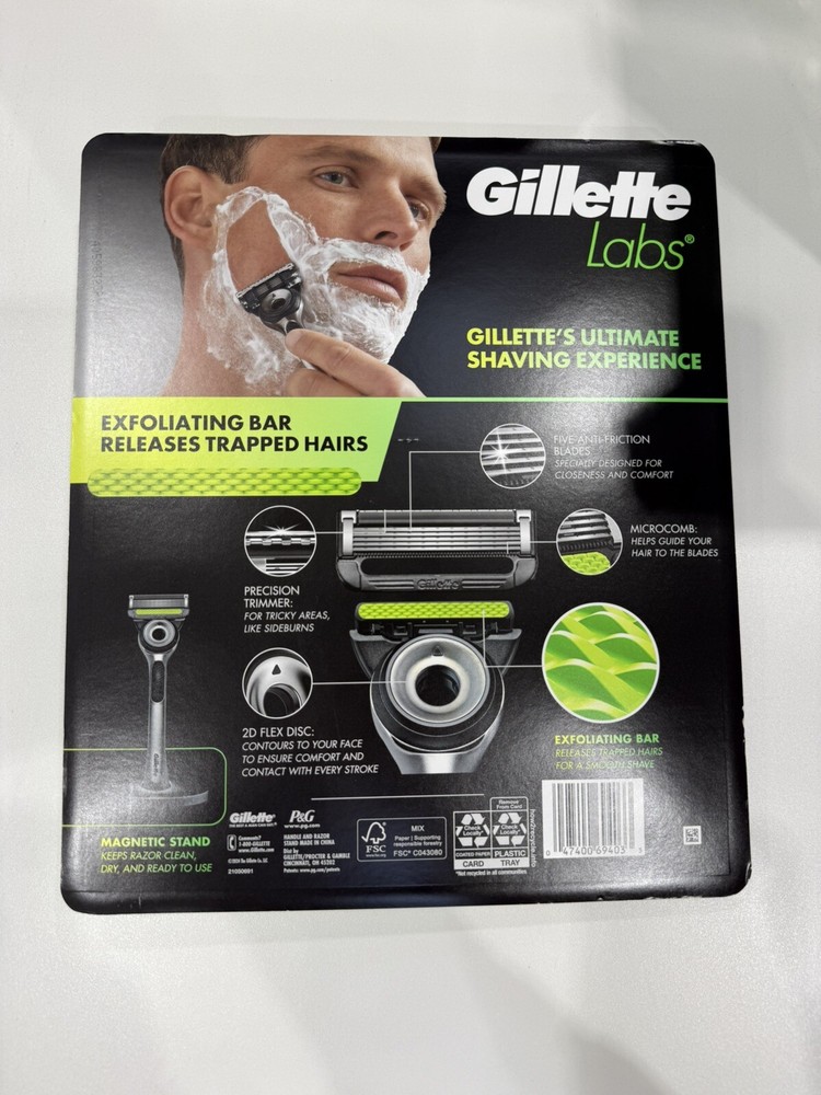 GilletteLabs men's razor gives effortless shaving in one efficient stroke Built-in exfoliating bar removes dirt and debris before the blades pass This razor for men features Gillette’s best razor blades for incredible comfort and closeness 1 Razor Handle 1 Razor Stand 8 Cartridges