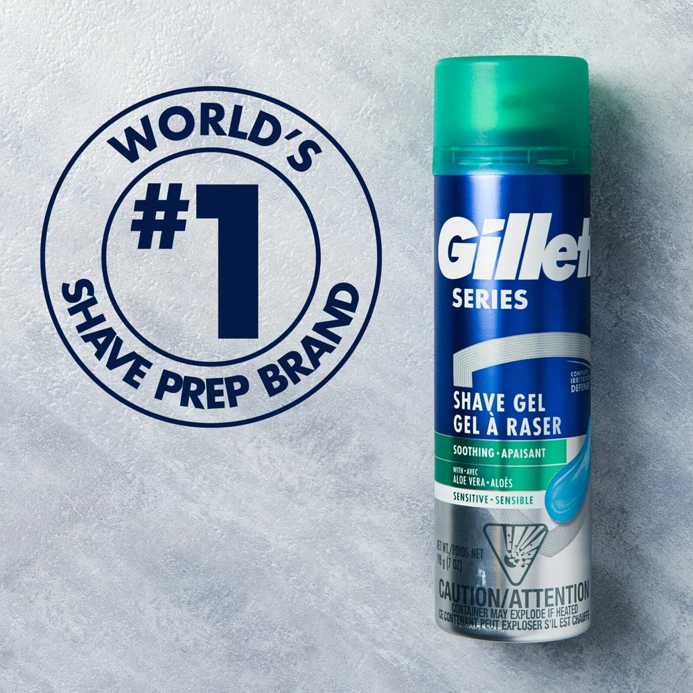 Cool down your skin with the Gillette Series Soothing Shave Gel with Aloe Vera. It provides complete defense against shaving irritation, helping reduce cuts, redness, burning, stinging and tightness with a formula that cools down your skin to soothe it while you're shaving. This shaving cream transforms into a thick lather, conditioning and hydrating each hair for a smooth shave infused with Gillette's signature classic scent. You'll also get an even smoother shave: This men's shaving gel contains extra moisturizers and lubricants (vs Gillette Classic Shave Foam) that hydrate each hair to shave it off with few tugs, pulls and friction. That means less time and energy spent on your grooming ritual and more comfort in your shave. Show the world your best face with the Gillette Series Soothing Shave Gel for men, made by the World's Number One Shave Gel & Foam brand. Apply a thick, even amount of shaving gel over the area. Using shave gel properly will help prevent moisture loss and add an additional layer of protection to avoid any nicks, cuts and hair pulls while you shave, and thus cut down skin irritation post-shave. For great results, use with the Gillette Mach3 or your favorite Gillette razor. Helps reduce CUTS, BURNING, STINGING, REDNESS and TIGHTNESS. Complete irritation defense: Gillette Series helps protect sensitive skin from the signs of shaving irritation POWERED BY EXTRA LUBRICANTS: Gillette Series Shave Gel has extra polymer lubrication technology (vs Gillette Classic Shave Gel) for a comfortable and clean shave - that means less tugs and pulls SENSITIVE FORMULA WITH ALOE VERA: Gillette Series Soothing Shave Gel helps shield your sensitive skin from shaving irritation COOL-TO-SOOTHE: Gillette Series Shave Gel helps reduce burning and irritation with a refreshing formula that cools down to soothe your skin when you're shaving. RUST FREE CAN Shaving Gel