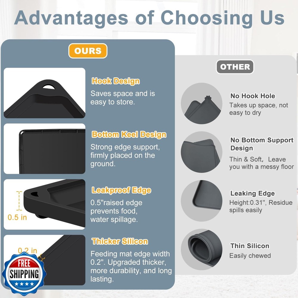 This pet food mat is a game-changer! The high edges keep spills contained, and cleanup is a breeze—just wipe or rinse. The food-grade silicone is durable and safe, plus it rolls up easily for storage or travel. Perfect for messy eaters, it keeps floors spotless while being super sturdy. My pets love it, and I love how much tidier mealtime is now! Highly recommend for any pet owner.