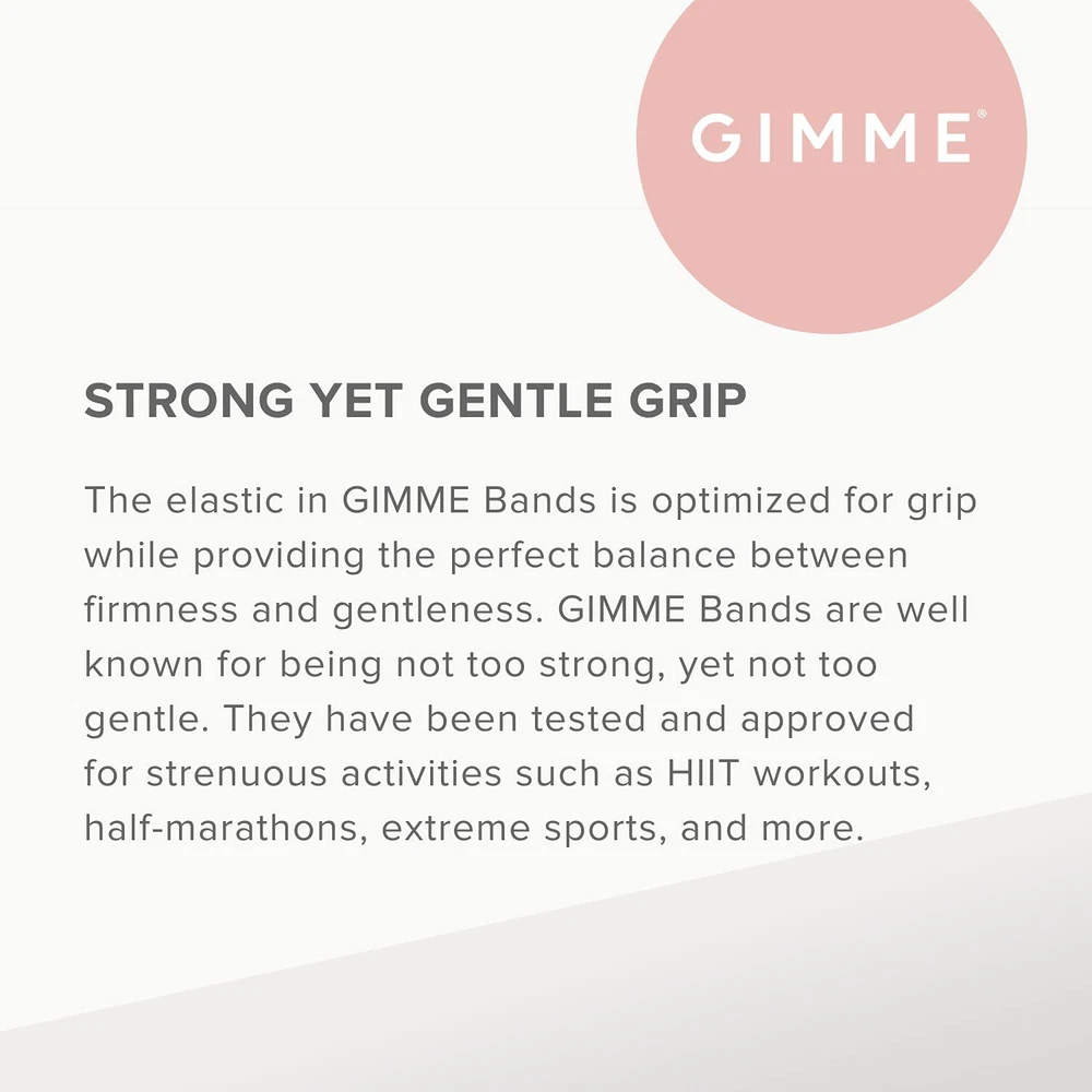 Top Rated Hair Elastics - These top-selling fabric hair ties are perfect for everyday use and compliment most hair types. Whether you have curly, long, straight or thick hair, we guarantee your ponytail will stay in place with comfort. Patented Design - Our patented material design is composed of hundreds of microfiber elastics that work together to spread tension and retain elasticity for a strong hold. Leave the worry behind of your ponytail holder breaking once and for all! Strongest + Longest Hold - Gimme Thick Fit Hair Bands can withstand up to 70 lbs. of pressure compared to standard elastics that break with an average of 8 lbs. of pressure. Secure Yet Gentle Grip - Enjoy a comfortable grip without the headache. Meet your go-to, grip-optimized seamless hair ties to secure a firm yet gentle hold for all hair types. Eliminate Bad Hair Days - Simply toss your Gimme Bands in the washer and dryer to shrink them back to their original size. It will also remove excess oils that build up on the hair band, helping each one feel fresh and new! At Gimme, we know hair solutions are not one size fits all. Each of you are unique, your hair care should be too. Product Description