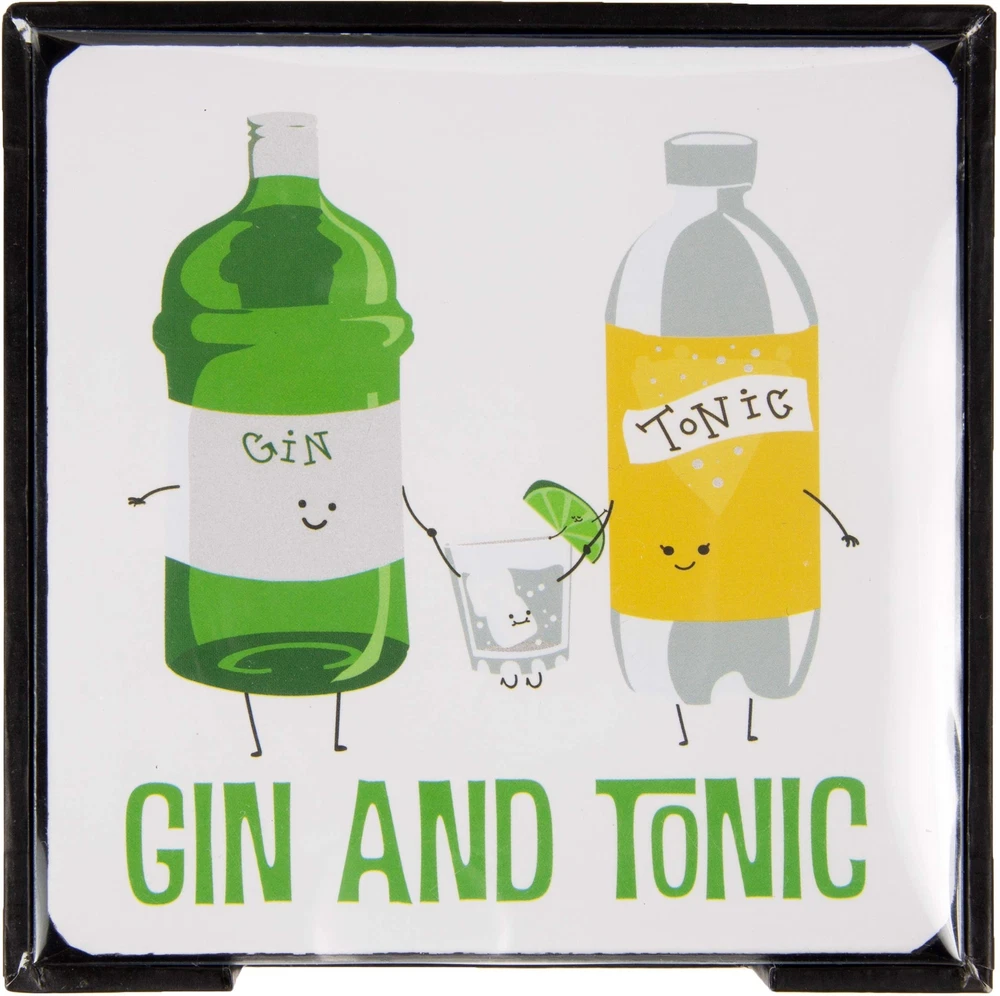 PREMIUM QUALITY: Set of four coasters, packaged in a printed open-faced box, are made from MDF with a cork backing. IN-HOUSE DESIGN: "Gin And Tonic", "Let The Party Be Gin", and "Just Renewed My Gin Membership" texts and glass and bottle icons are printed onto individual coasters. PERFECT FOR GIFTING: Perfect for those who wish to show their love of gin and tonic. CARE INSTRUCTIONS: Wipe clean with a damp cloth. MORE PRODUCTS: Lounge pants, t-shirts, and glassware in the same style are also available.