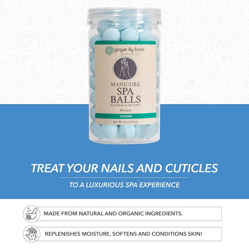 Manicure Spa Balls: Ginger Lily Farms Botanicals Manicure Spa Balls prepares nails and cuticles for manicure service. Natural & Organic Spa Balls: These natural and organic spa balls contain organic jojoba oil and tea tree oil to help replenish moisture, soften and condition skin. Easy to Use: To use, drop one Manicure Spa Ball into a bowl with warm water to dissolve, place hands into the water and soak for 3-5 minutes. Just sit back and relax while soaking! Scented Spa Balls: The fresh scented spa balls add a little extra touch in the manicure bowl. The pure citric acid in the manicure balls whitens nails and softens the cuticle which saves time. Quantity: The 8oz pack contains 80-count of ocean scented manicure spa balls.