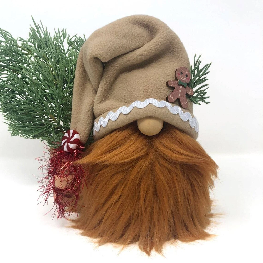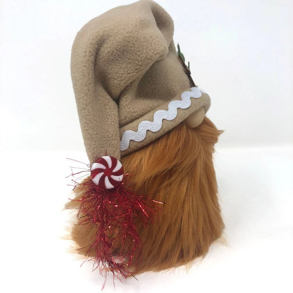 Gingerbread Gnome | Holiday Gnome Decor, Tomte, Christmas Gnome Materials: fleece, wooden nose, floral accents Width: 5 inches Height: 8 inches About this item Gnomes are famous not only for their gardening skills, but also for making delicious meals and snacks. This decorative gnome is not edible, but looks good enough to eat with his gingerbread man-inspired outfit. Perfect gnome for your holiday decor or as a gift for that special someone! Gnome stands approximately 8" (20cm) tall, and 5" (13cm) around. He is made with a cotton poly blended fabric stuffed with fill and weighted at the bottom for stability, a red faux fur beard, and a wooden nose. His soft fleece hat has a gingerbread man above the brim with a decorative pine spring behind it, a peppermint button with red garland at the tip, and white zig-zag ribbon that gives the impression of a trim of yummy frosting. Each gnome is lovingly handmade and some slight variations from the one pictured are possible. Greenery and photo props are not included with your gnome purchase. Thank you for visiting our shop, let us know if you have any questions.