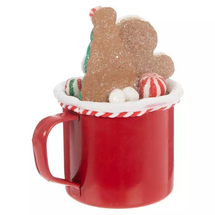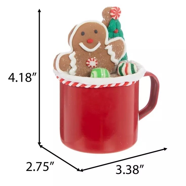 The product is a festive Christmas ornament featuring a red mug with a Gingerman inside, designed by Hobby Lobby. It is part of the Ornaments collection and is made of mixed materials including resin and metal. The Gingerman in a Mug ornament is a decorative item with a Christmas theme, perfect for adult table decor during the holiday season. Create adorable Christmas displays with a Gingerbread Man In A Mug. This sweet piece resembles a red mug filled with hot cocoa. Sitting inside is a clay gingerbread man with two small peppermint candies and a mini tree next to him. Place this mug in the kitchen with other decor inspired by your favorite sweet treats this holiday season! Dimensions: 4.18" H x 3.38" W x 2.75" D Material: Clay & Plastic Color: Red, White, Green & Brown Pattern: Stripes Quantity: 1