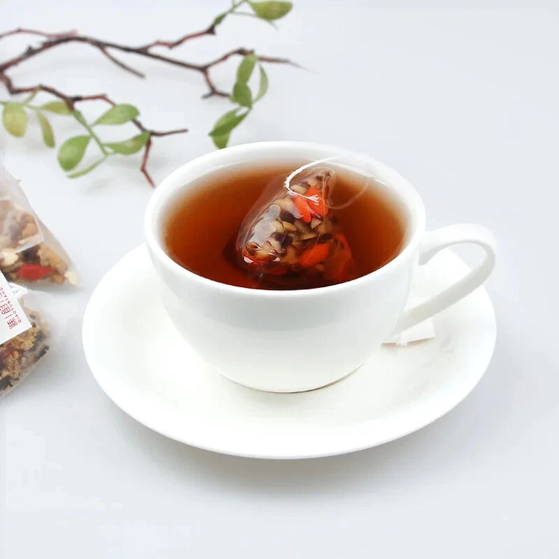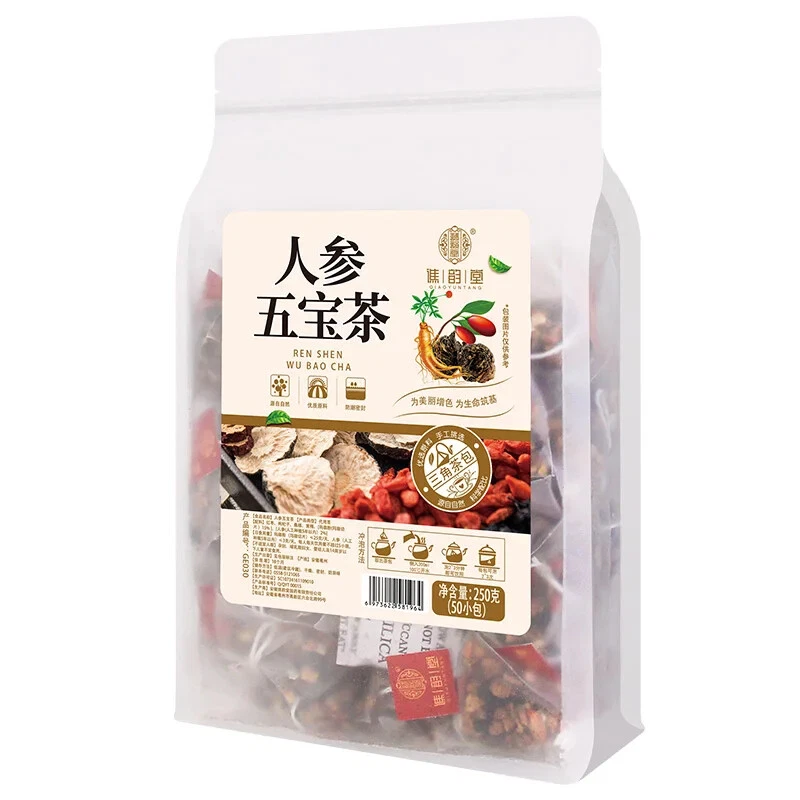 Name: Ginseng Five Treasure Tea Type: substitute tea Specification: 250g/bag=50 small bags Storage method: in a cool and dry place Ingredients: jujube goji berry mulberry, Huangjing maca powder ginseng This product adopts a triangular tea bag design, which can prevent tea ingredients from entering the mouth when drinking. Independent small bags are more convenient. All raw materials are of good quality and scientifically proportioned
