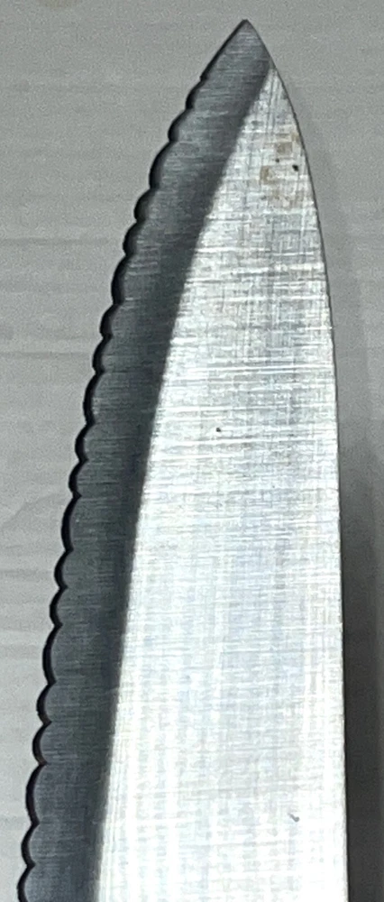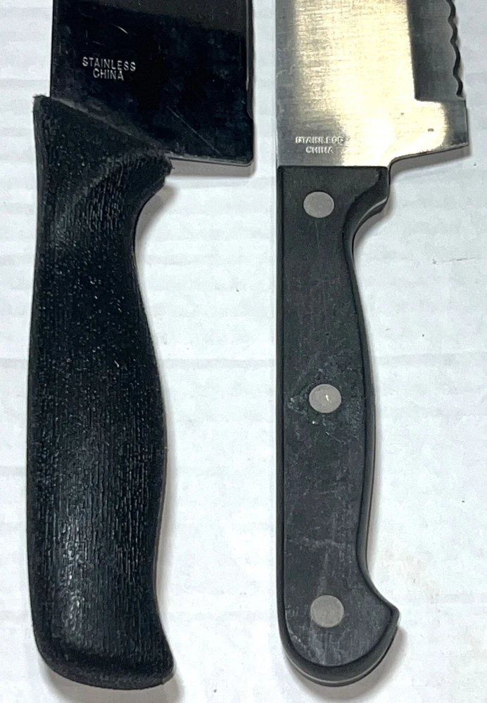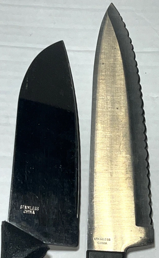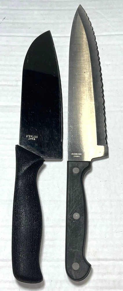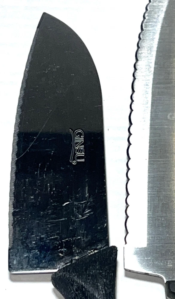 Blade Edge: Serrated Set Includes: Bread Knife, Carving & Slicing Knives, Chef's Knife, Knife Set, Santoku Knife, Serrated Knife, Slicer, Utility Knife, Bagel Utility Spreader Knife, Removable Knife Guard Features: Dishwasher Safe, Easy Clean, Multi Functional, Reusable, With Blade Cover Food Compatibility: Meat, Universal, Vegetables Country/Region of Manufacture: China Number of Items in Set: 3 Material: Plastic, Stainless Steel Seller Notes: “Great gently used pre-owned condition with some various normal usage wear, etc. See pics.” Personalize: No Brand: Ginsu Type: Knife Set Handle Material: Plastic Blade Length: 8 in