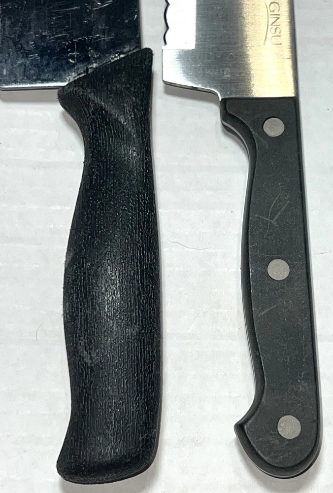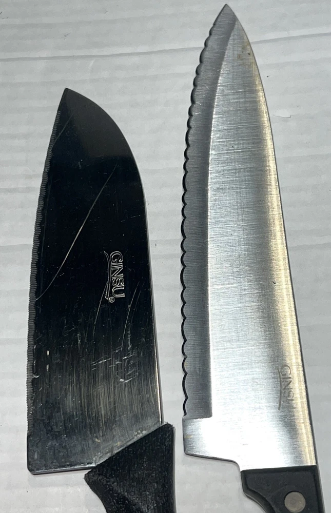 Lot of 3 Ginsu Knives: ~ Original Ginsu Santoku 6.5" Stainless Steel Blade / 11.25" L Serrated Chef Knife With Plastic Handle ~ Ginsu Full Tang 8" Blade / 11.25" L Triple Riveted Scalloped Serrated Carving Slicing Slicer Knife ~ Ginsu Bagel Spreader Serrated Edge Slicing Utility Knife With Plastic Handle & Removable Plastic Blade Guard Cover. 8 1/4" L with 4" Stainless Steel Blade. Great gently used pre-owned condition with some various normal usage wear, etc. See pics.