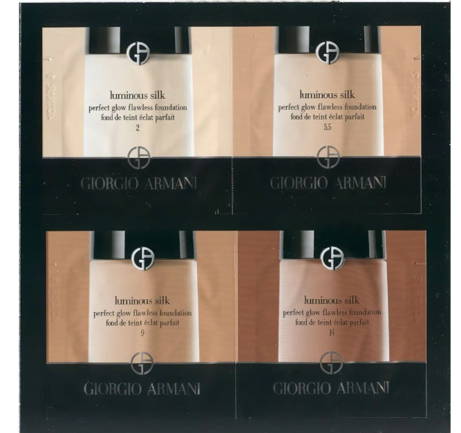 Giorgio Armani 4PK Luminous Silk Foundation 4 Sample Shades 2, 5.5, 9 & 14 This lightweight foundation with Micro–fil™ technology allows color pigments to lay flat for seamless blending and layering. A makeup artist and celebrity favorite, this hydrating foundation helps improve skin texture and blur imperfections, all while delivering a long-lasting, lit-from-within glow.