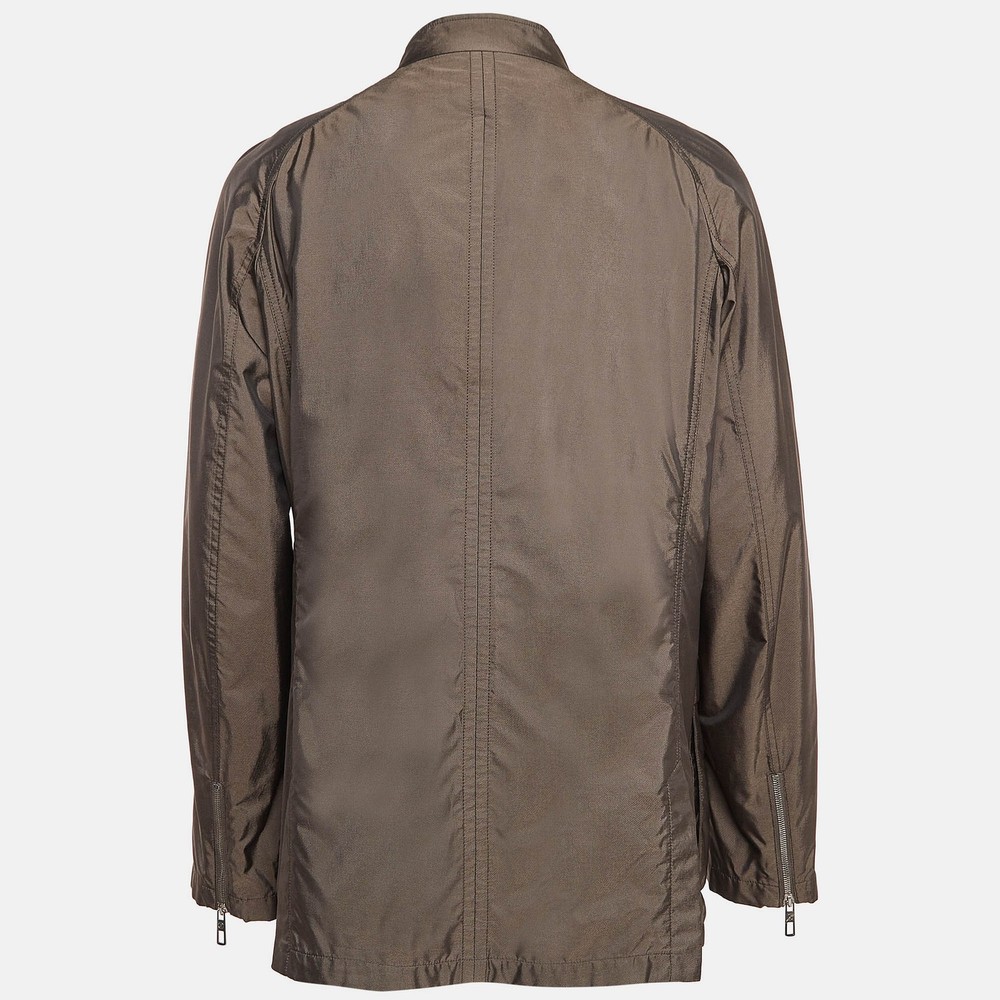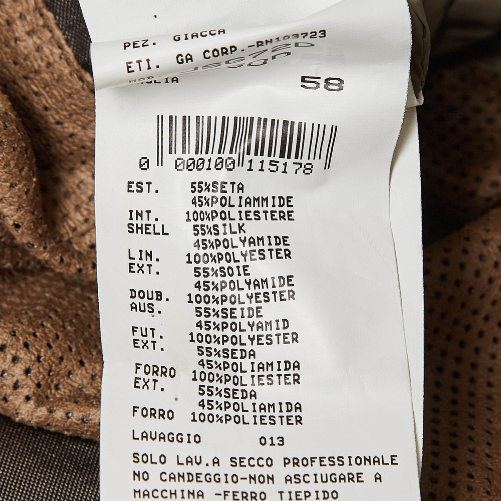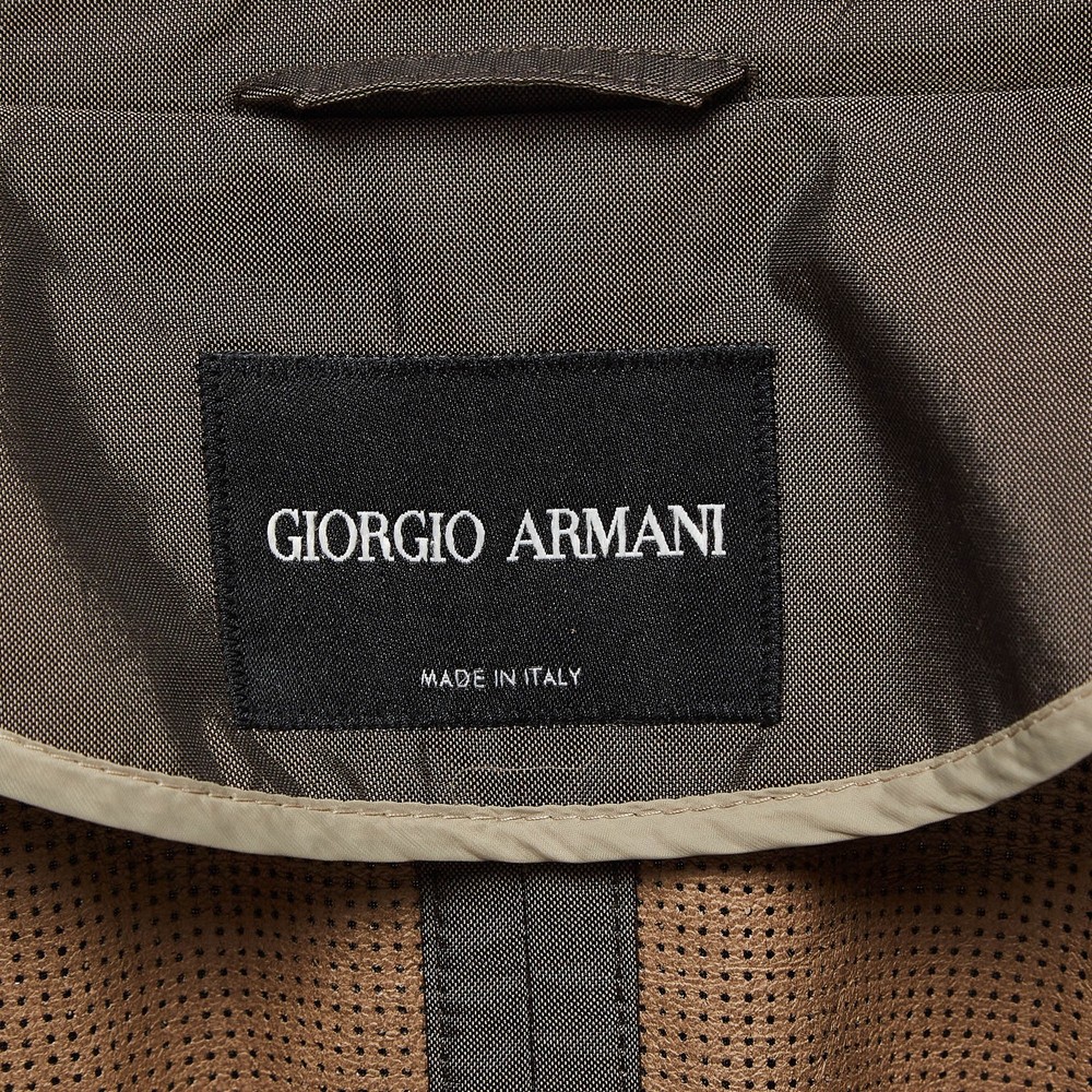 This Giorgio Armani brown jacket offers the satisfaction of a comfortable fit and refined style. It is made of quality fabrics and designed with a front closure, two pockets, and long sleeves.Certified by The Luxury Closet - This item has gone through a detailed authentication process overseen by our experts. We offer a lifetime guarantee of authenticity on all our items. Import duties, taxes and charges are not included in the item price. These charges are the buyers responsibility. Please check with your country’s customs office to determine what these additional cost will be prior to buying. Our eBay Store About Us Contact Us Add to Favorite Sellers Giorgio Armani Brown Silk Blend Jacket XXXL $125.4 This Giorgio Armani brown jacket offers the satisfaction of a comfortable fit and refined style. It is made of quality fabrics and designed with a front closure, two pockets, and long sleeves. Product Details Brand Color Brown Dimensions Material Silk Blend Size XXXL Outsole Width Outsole Length Heel Height Includes The Luxury Closet Packaging Certified by The Luxury Closet This item has gone through a detailed authentication process overseen by our experts. We offer a lifetime guarantee of authenticity on all our items. How We Check The in-house team of experts at The Luxury Closet is highly trained to verify the authenticity and the condition of the luxury products. They ensure that only 100% authentic items are put on sale.The evaluation process is unique with its own mix of assessment criteria and differs according to the category. Each item is evaluated based on the following combination of hallmarks, hardware, stitching, symmetry, material, craftsmanship, stamping, codes, hologram stickers, and packaging. Our authenticators also check if the items have been modified or amended (e.g., aftermarket diamonds, replaced batteries, repaired bags, etc.) International Buyers Import duties, taxes and charges are not included in the item price. These charges are the buyers responsibility. Please check with your country’s customs office to determine what these additional cost will be prior to buying.