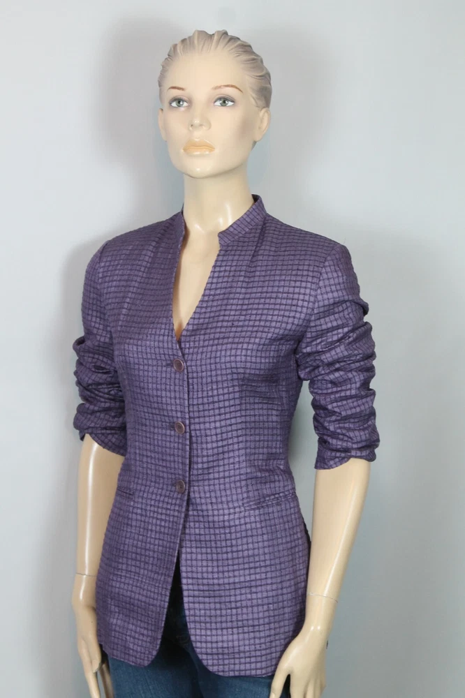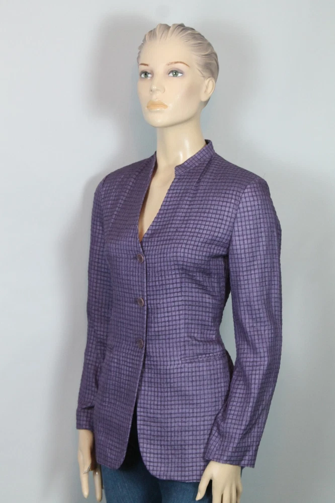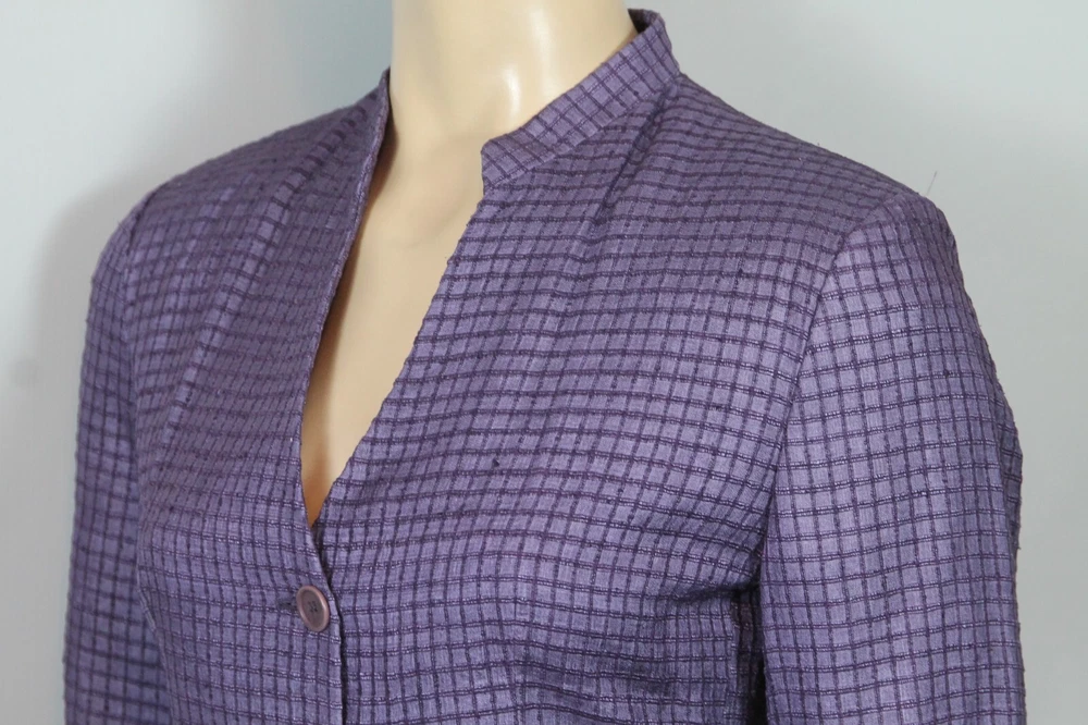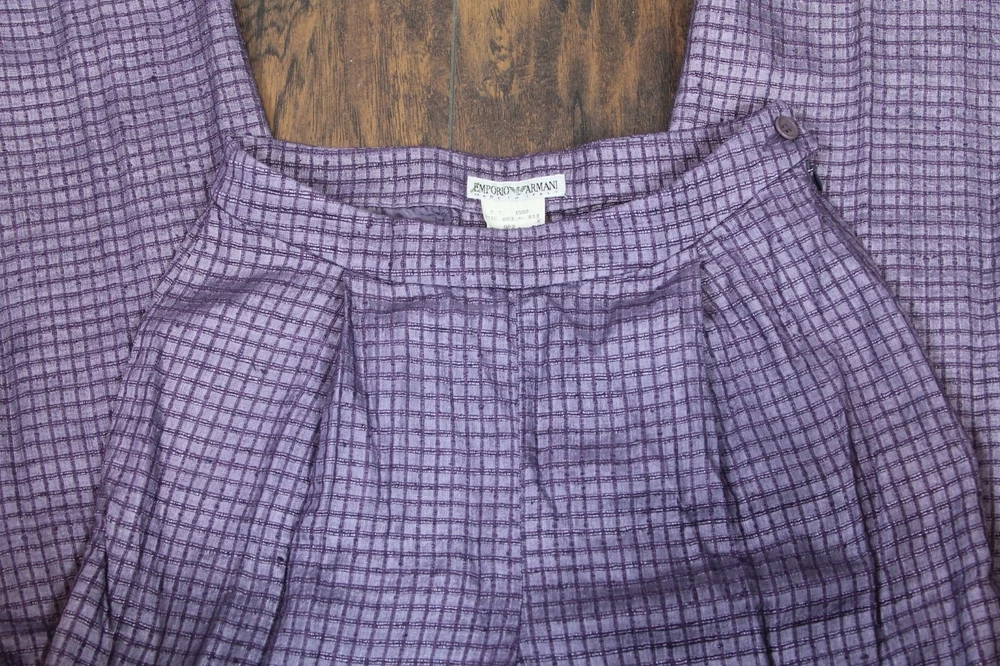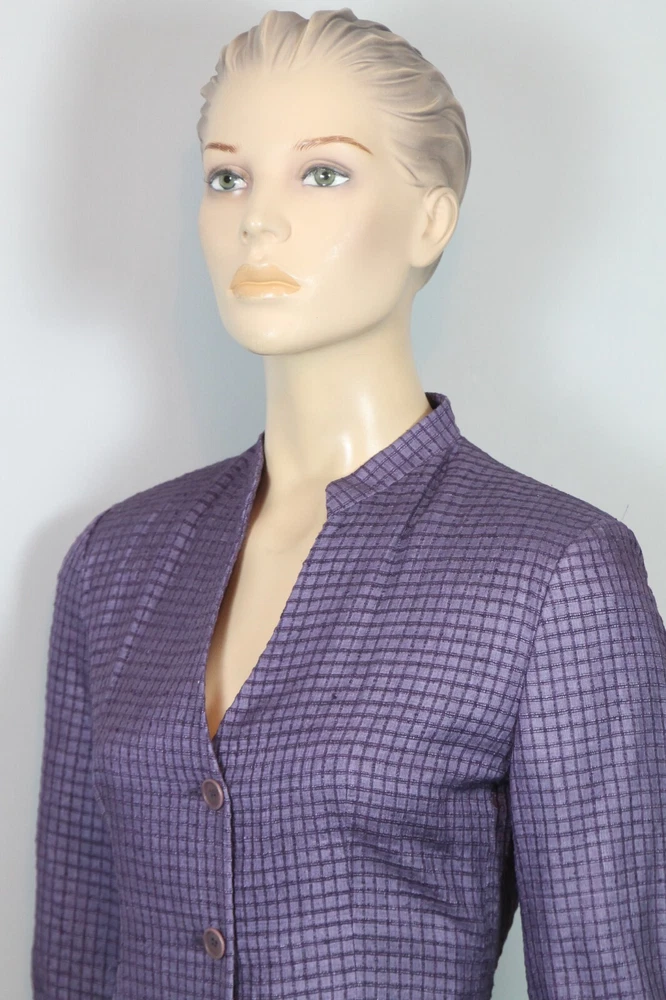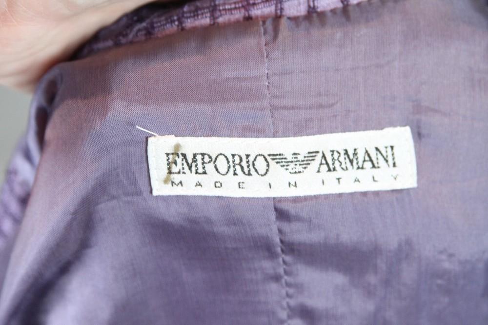 Elevate your professional wardrobe with EMPORIO ARMANI GIORGIO ARMANI Made in Italy pure silk suit set, a testament to classic Italian elegance. The ensemble includes a well-tailored blazer jacket with stunning design and matching pants, both in a sophisticated Iris purple color that lends confidence to any business setting. Crafted with meticulous attention to detail, this two-piece pant suit is designed to flatter. The suit is an embodiment of timeless style, seamlessly blending functionality with high fashion, perfect for the discerning woman who values both comfort and sartorial excellence. Size and Measurements Garment measured flat from side to side. 40 Jacket - Bust:19" Length:27" Sleeves:23.5" Pants - Waist:13" Hip:20" Inseam:29" Condition: Pre-owned great gently used condition. Original owned was a smoker, now suit is ozone treated to eliminate the odor. Please see detailed pics. If you have any questions or concerns, please don't hesitate to ask. (H/R) Track Page Views With Auctiva's Counter