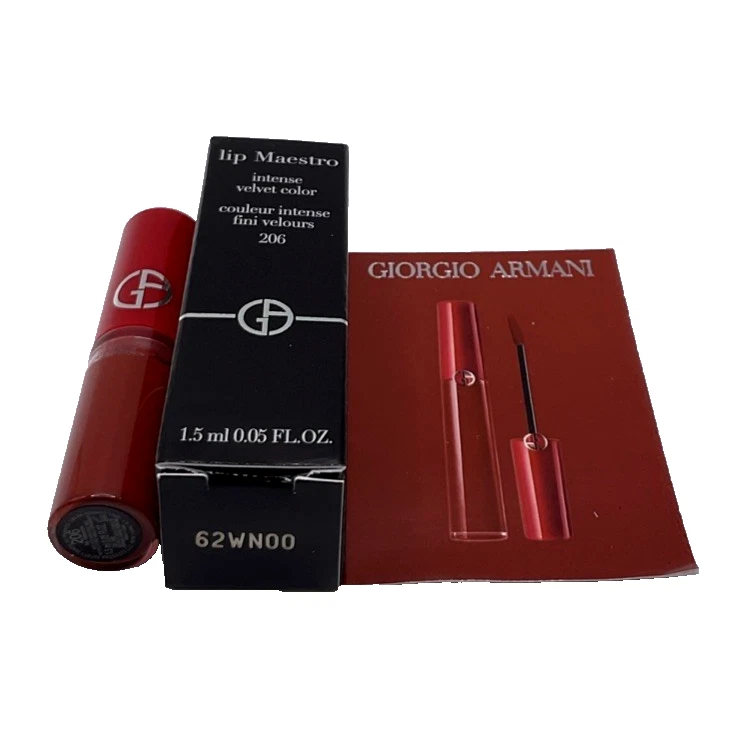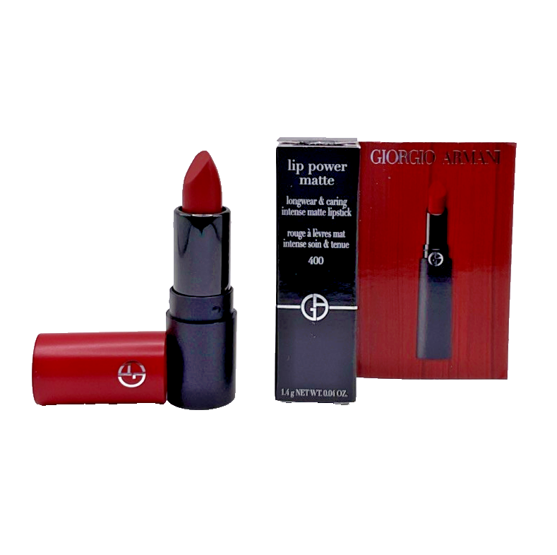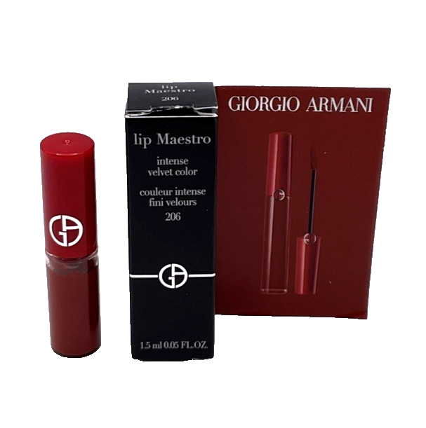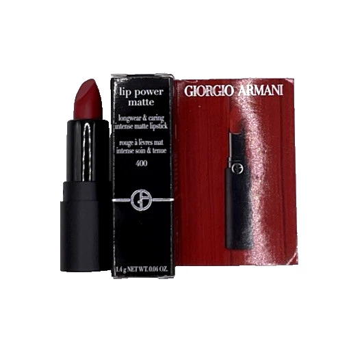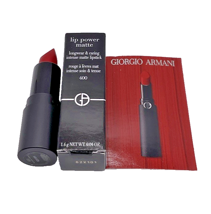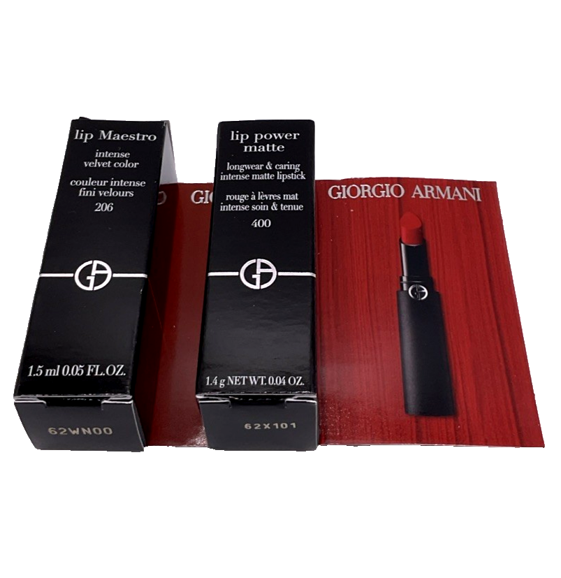 Brand New in Box 2 Piece Lip Set Giorgio Armani Lip Power Matte & Lip Maestro Giorgio Armani Lip Power Matte Longwear & Caring Intense Matte Lipstick 400 1.4g / 0.004 oz Discover Lip Power Long-Lasting Matte Lipstick, a long-wear caring matte lipstick with rich pigment-infused Jojoba Oil and Organic Olive Oil that nourish the lips and deliver all-day comfort. Formulated with a unique soft-glide technology for plush and creamy application. This long-lasting matte lipstick instantly delivers color impact in a single swipe. The richly pigmented lipstick glides on effortlessly and smooths the appearance of fine lines and dries down to a non-drying matte finish. All lipstick shades are formulated with coated pigment to enhance wear and color. For control with precision application, the drop-shaped bullet carefully helps line and shape the lips. Giorgio Armani Lip Maestro Intense Velvet Color 206 1.5ml / 0.05 fl oz Giorgio Armani's legendary liquid lipstick pushes the boundaries of lip color thanks to its revolutionary formula that creates a luminous matte finish with a soft velvety feel that keeps lips looking supple and smooth. This matte lipstick is lightweight and non-sticky, offering long-lasting color that doesn't feather, fade, or settle into fine lines. Pigments permeate the gel formula to deliver an intense, full coverage liquid lip to complete any makeup look. All products are 100% authentic from our distributor and are stored in a climate controlled, pet-free, smoke-free environment.