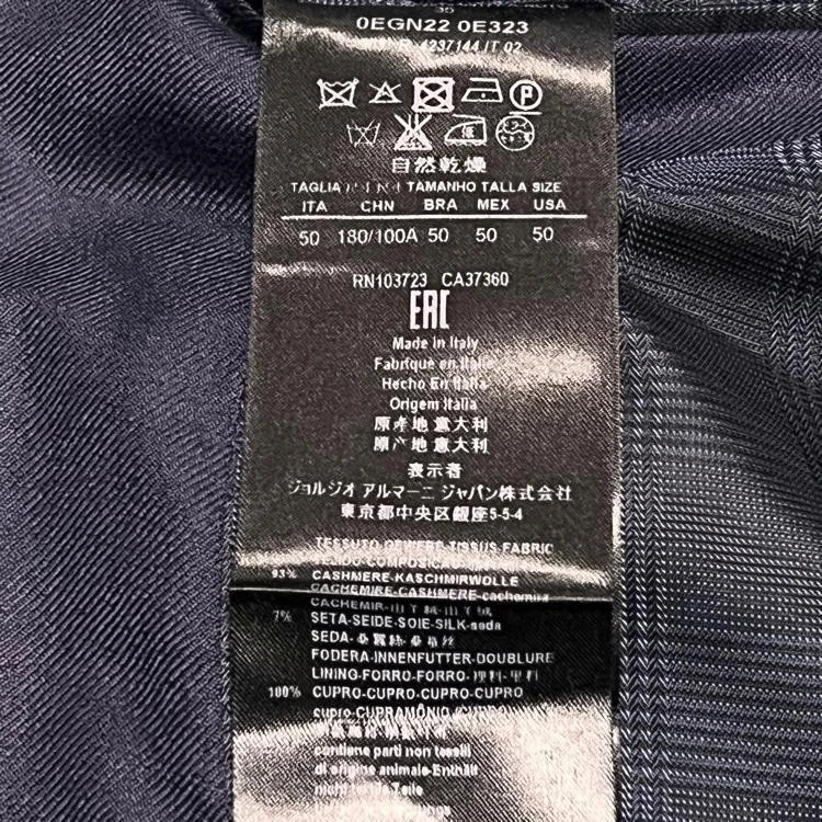Description Thank you for your interest. Brand: GIORGIO ARMANI Size: 50 Actual size: Shoulder width 47cm x Width 53cm x Sleeve length 64cm x Total length 76.5cm ・Please note that there may be slight differences in measurements due to flat measurements. Model: 0EGN22 0E323 Design: Men's 2B single-breasted jacket (fully lined) Color: Navy Material: Fabric: 93% CASHMERE 7% SILK Lining: 100% CUPRO Accessories: None (hanger not included) Condition: This item is in good condition with little signs of wear. There are some scratches and creases. There is no noticeable damage and it is still a good item to use. Please note that as this is a pre-owned item, there may be minor scratches, stains, odors, repairs, etc. that are difficult to notice. Whitish-colored items may become discolored or yellowed due to storage. Light scratches and wrinkles may appear during storage. (Especially leather items) This item is not new, but a used item that was given away. Please check the photos for the condition of the item. Please understand that the condition of the item is subjective and the standard of evaluation and feeling may vary from person to person, so please be aware that this is a used item before bidding. Please check the photos for the condition of the item, such as scratches and stains. To prevent problems, please feel free to contact us if you have any questions about the size or other details of the item. We will be happy to adjust the price. We will do our best to ship your order as soon as possible. We will do our best to ship as soon as possible, but there may be delays during the busy harvest season. Remarks All the products we sell are obtained and sold by pawn shops that are authorized brands, so all the products we handle have been authenticated to meet our strict standards for authenticity, so please buy with confidence. Payment Supports managed payments Please pay within 5 days after auction is finished. About Us We are located in Japan. It's our pleasure to make you happy by proposing our recommend item. If you have any questions or request about items, please feel free to ask us. International Buyers - Please Note: -Importduties, taxes, and charges are not included in the item price or shipping charges. These charges are the buyer's responsibility. -Please check with your country's customs office to determine what these additional costs will be prior to bidding/buying. -These charges are normally collected by the delivering freight (shipping) company or when you pick the item up - do not confuse them for additional shipping charges. -We do not mark merchandise values below value or mark items as - gifts - The US and International government regulations prohibit such behavior. Thank you for your understanding