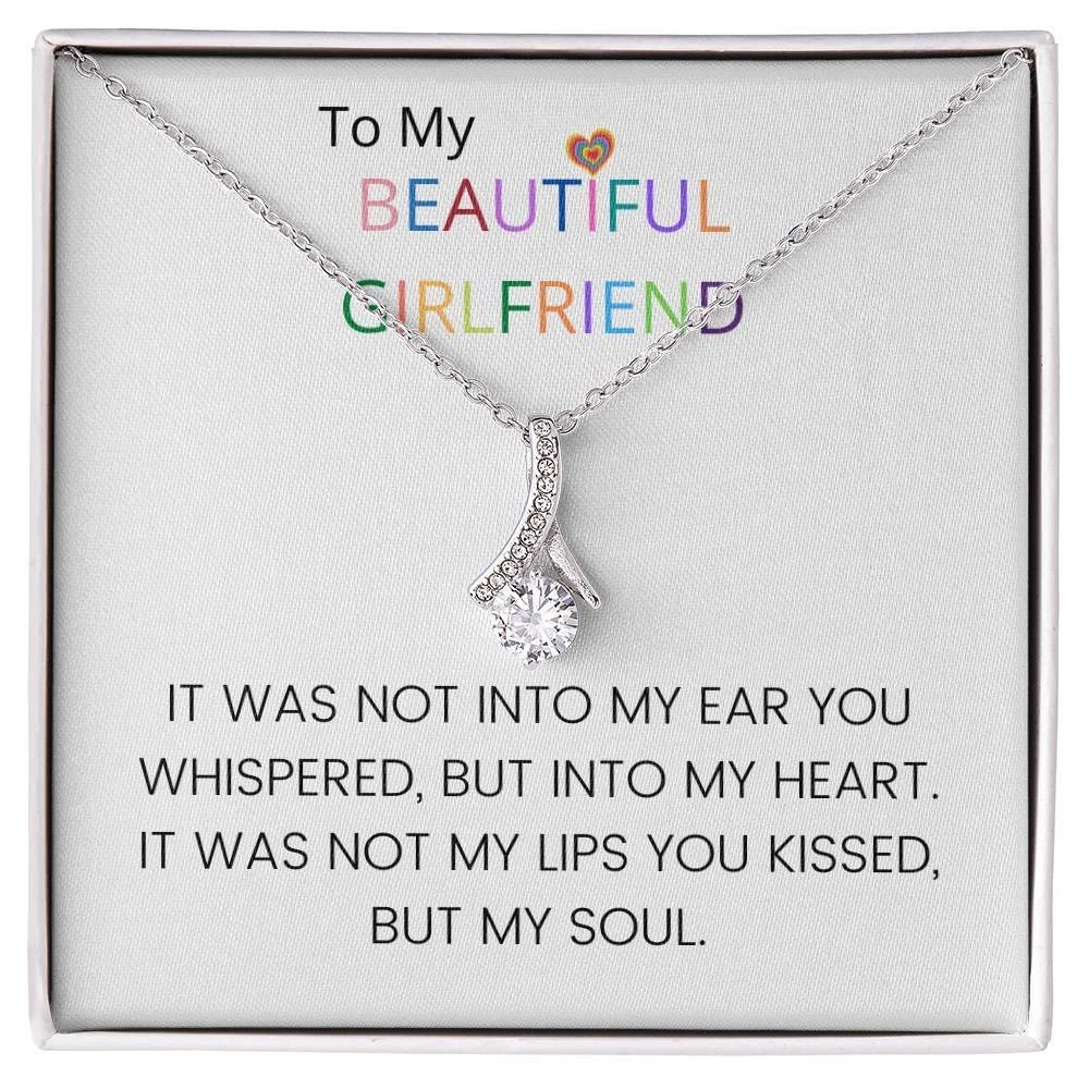 To My Beautiful Girlfriend It was not into my ear you whispered but into my heart. It was not my lips you kissed but my soul. Imagine her reaction when she opens this stunning gift! The Alluring Beauty necklace features a petite ribbon shaped pendant that is sure to dazzle your special someone. Whether it's a birthday or anniversary, make sure to get her a gift she will love for years to come. 14k white gold finish or 18k yellow gold finish over stainless steel 7mm cubic zirconia Pendant dimensions: 0.8" (20mm) height / 0.4" (10mm) width Adjustable length: 18" - 22" (45.72 cm - 55.88 cm) Lobster clasp Your piece is lovingly packaged in a complimentary soft touch box for easy gifting. Elevate your presentation by upgrading to the mahogany style luxury box, which features a brilliant LED spotlight.