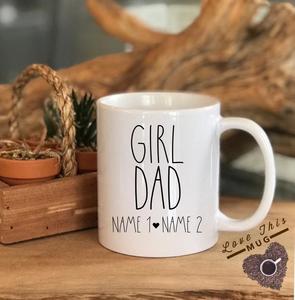 Girl Dad Mug Personalized Dad Mug Custom Names Of Daughters Dad With 2 Girls Dad Product Details.. This high quality 11oz. ceramic white mug has a premium hard coat that provides crisp and vibrant color reproduction sure to last for years. Perfect for all hot & cold beverages. The highest quality printing possible is used. It will never fade no matter how many times you wash it. Material: 100% Ceramic. Print both sides. Dishwasher and Microwave Safe. High Gloss + Premium White Finish. Printed in the U.S.A. Personalized & Custom. We support personalized and custom mug to add custom, when placing an order, you can add notes to the "order note" in shipping address section. Also you can contact us directly via message. Shipping Info. Ready to ship in 1 to 2 business days, All products are made-to-order and proudly printed in the United States. Shipped by USPS and DHL, You will receive your order in 5-7 days. Replace & Refund. All products are defective during shipping broken, chipped will be replaced free of charge. You are not satisfied with the product, we will refund 100% money to you. If any other issues arise, please do not hesitate to message, we would be more than happy to assist you.