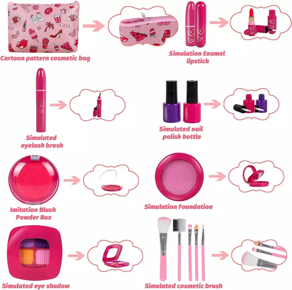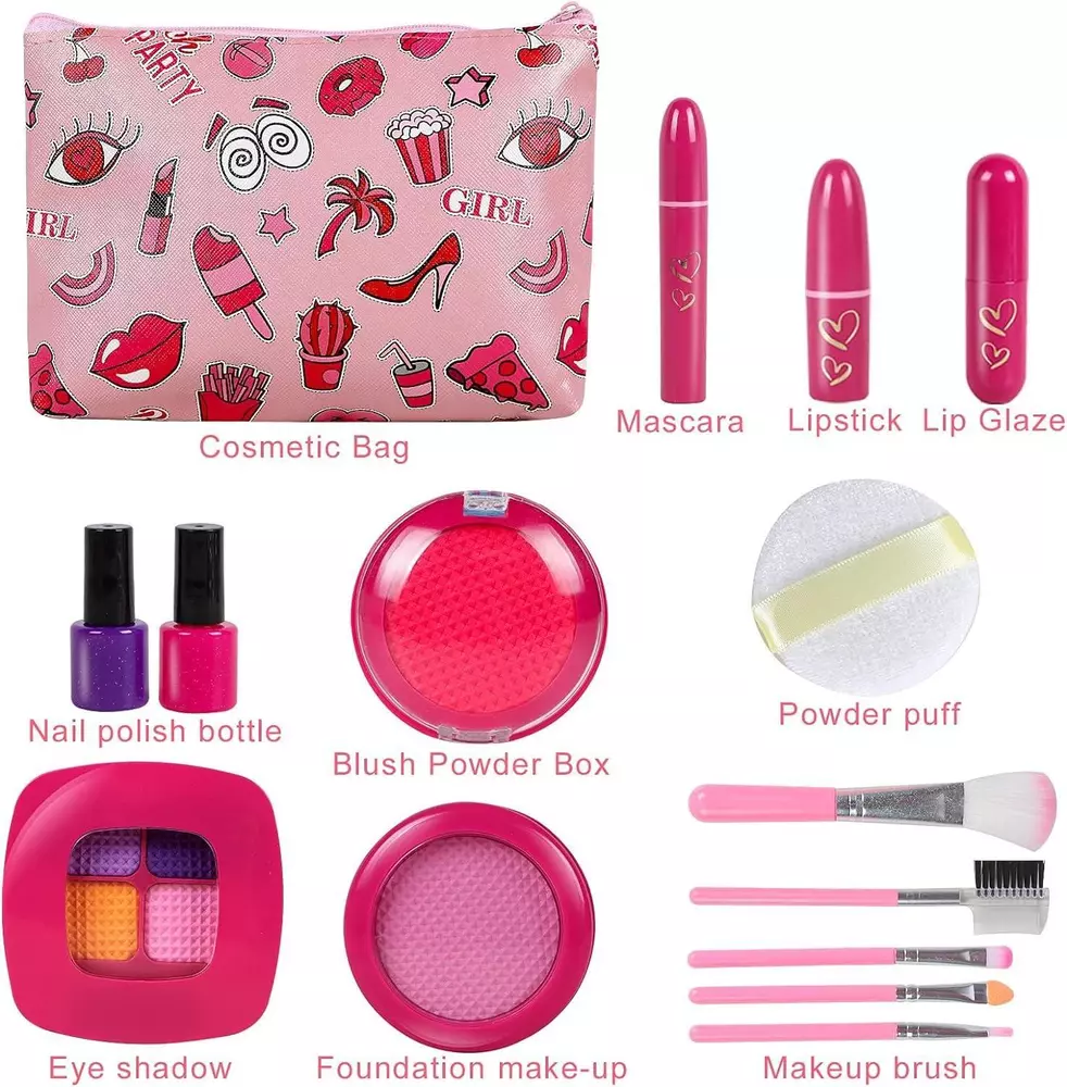 CONTACT US DIRECTLY FOR FREE & PREPAID RETURNS Girl Gifts Pretend Play Makeup Toys Beauty Set for Toddler Little Girls Age 3 4 Girl Gifts Pretend Play Makeup Toys Beauty Set for Toddler Little Girls Age 3 4 5 6-8 Kids Your Princess Niece Granddaughter Birthday Halloween Christmas (Fake Cosmetic 15Pcs Kits) Description Item model number RGMZ-1 Product Dimensions 8 x 5 x 1.18 inches Country of Origin China Item Weight 7 ounces Manufacturer recommended age 3 years and up Department Girls đŠđ§đ§ăPretend Make Up Looks Like MomâsăPretend makeup kit looks like real makeup cases but filled with colorful EVA foam, which comes with lipstick, lip gloss, blusher, eyeshadow, powder, makeup brushes. Without applying to skin, this toy makeup is perfect for baby girls who wants to be just like mom. Save Moms Expensive Cosmetics and Unleash Kidsâ Creativity. â¤ď¸ăđŻSafe Quality Bring More FunđŻăASTM and CPC certificated Toddlers Makeup Kit. Non-toxic material with eco-friendly foam cosmetic toys with rounded edges to avoid injury and ensure children safe play and no mess to clean up, also donât worry about toddlerâs sensitive skin. đăLearn by imitating and pretendingăGirls love to imitate their moms apply makeup. RONGGE play makeup set for toddlers is designed to inspire imaginary and creative play, allowing your little girls enjoy to âput makeupâ on herself, her dolls or other people. đď¸ăPackage IncludeăThe RONGGE pretend make up toys kits includes 15 total pieces: cosmetic bag with zipper, quad compartment bright eye shadow, bronzer and blush combo, lip gloss, eye catching foundation with mirror, makeup brush set, lipstick, and nail polishes. đăBest Gifts for GirlsăOur fake makeup set is not a real cosmetic that there is a colored soft foam made of kid-safe foam and plastic instead of an actual. The kids make up sets is designed for 3 4 5, 6-8 year old toddler girls. Good choice for birthday, festival and Christmas as a gift for little girl. Let the imagination run wild and enjoy hours of play with a complete pretend make up set, designed especially for your little princess! Product Description RONGGE Girl Toys Makeup Kit for Your Little Princess to Pretend Play to Apply Makeup Children will imitate the behavior of adults. Children see their mothers doing makeup every day. They will pretend that they are also making up, but real cosmetics will damage the skin. You will like our makeup set toy because kids toy makeup have real makeup feelings and are safe. Made of non-toxic materials, it gives you and your children a more secure experience. Why choice RONGGE pretend make up set? If your little girl is obsessed with make up but she was 2. If your little girl is trying to waer your expensive cosmetics and mess everywhere. If you are worry about comestic makeup was not apply to your little girlâs skin. If you are looking for some kind of play makeup kit for your little girl. RONGGE pretend makeup set for little girls will be your idea choice. Package Include The RONGGE pretend make up toys kits includes 15 total pieces: cosmetic bag with zipper, quad compartment bright eye shadow, bronzer and blush combo, lip gloss, eye catching foundation with mirror, makeup brush set, lipstick, and nail polishes. Safe Quality Bring More Fun ASTM and CPC certificated Toddlers Makeup Kit. Non-toxic material with foam cosmetic toys with rounded edges to avoid injury and ensure children safe play and no mess to clean up, also donât worry about toddlerâs sensitive skin. Learn by imitating and pretending Girls love to imitate their moms apply makeup. RONGGE play makeup set for toddlers is designed to inspire imaginary and creative play, allowing your little girls enjoy to âput makeupâ on herself, her dolls or other people. Best Gifts for Girls The kids make up sets is designed for 3 4 5, 6-8 year old toddler girls. Good choice for birthday, festival and Christmas as a gift for little girl. Let the imagination run wild and enjoy hours of play with a complete pretend make up set, designed especially for your little princess! Fake but looks like real With realistic shape and shade, kids play make up kit looks and feels just like real makeup, but it completely fake and mess-free. Meets Safety Standards for Childrenâs Use Encourages imagination and creative play via pretend play makeup set with safety material. Unleash Kidsâ Creativity Ideal for creative and imaginative play to aid in your child's healthy development. Girl Gifts Pretend Play Makeup Toys Beauty Set for Toddler Little Girls Age 3 4 5 6-8 Kids Your Princess Niece Granddaughter Birthday Halloween Christmas (Fake Cosmetic 15Pcs Kits) REVIEWS The product came very well packaged. I'm very happy. thank you for everything. Seller strongly recommended. This is great! I definitely recommend! Product looks amazing Delivery was fast. Excellent seller, great communication. I advise everyone