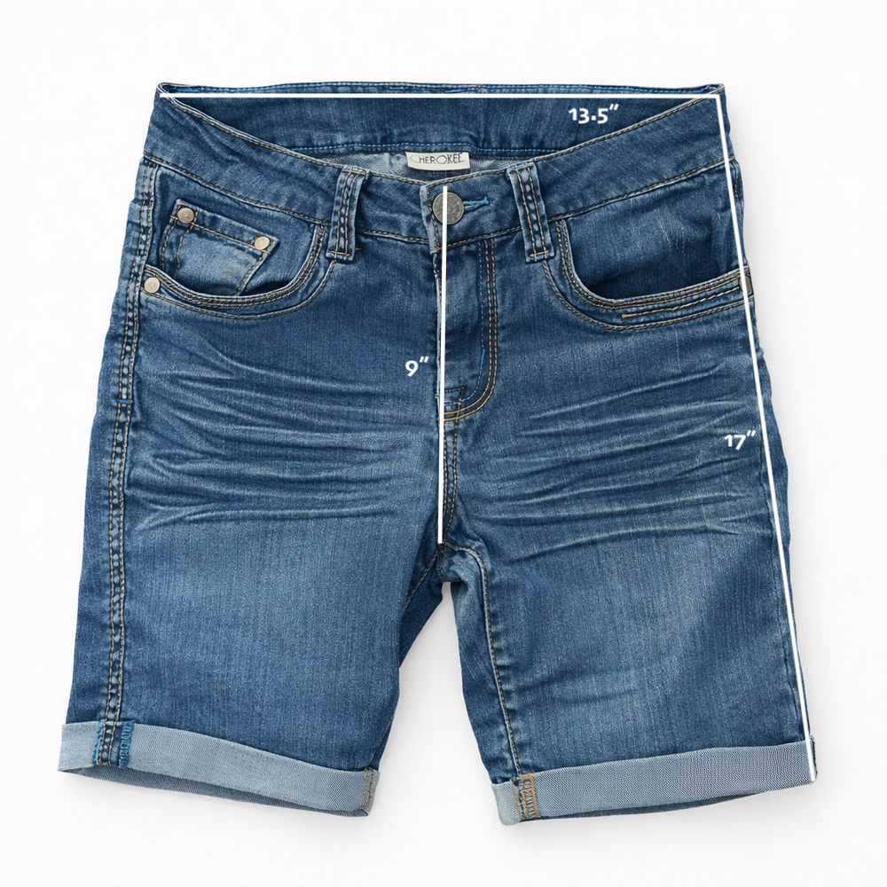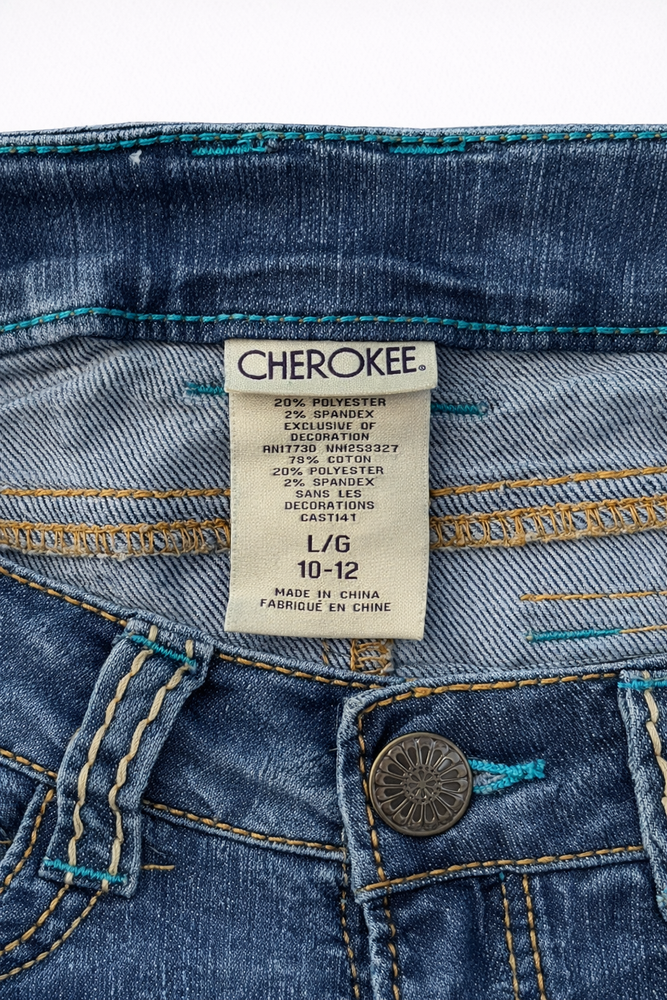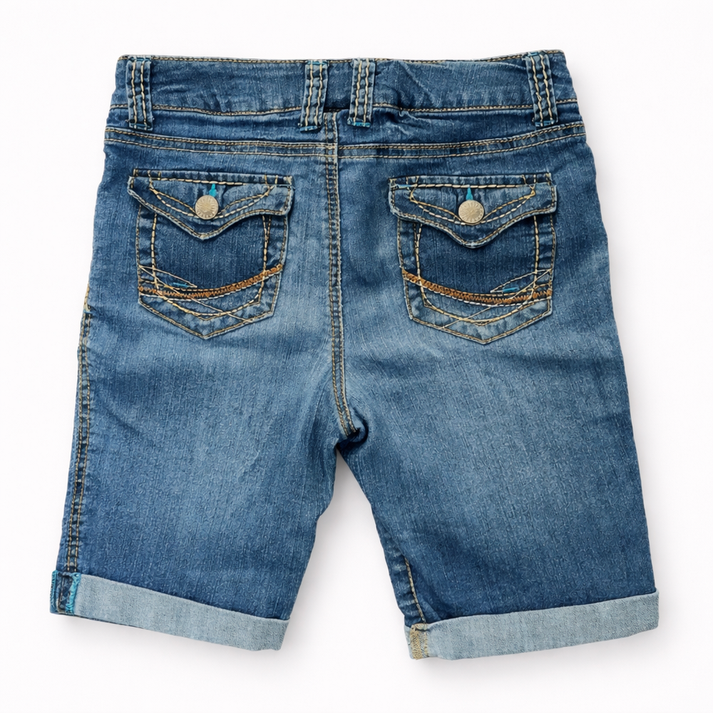 Cherokee Distressed 7" Denim Shorts Girls size Large (10-12) Cute everyday shorts with a fitted look. Medium wash blue denim with cuffed hems, contrast stitching, and classic 5-pocket styling. Pre-owned in good condition. There are tiny holes on the front and scratch marks near the left pocket. The rubber band used to adjust the waist is missing.
