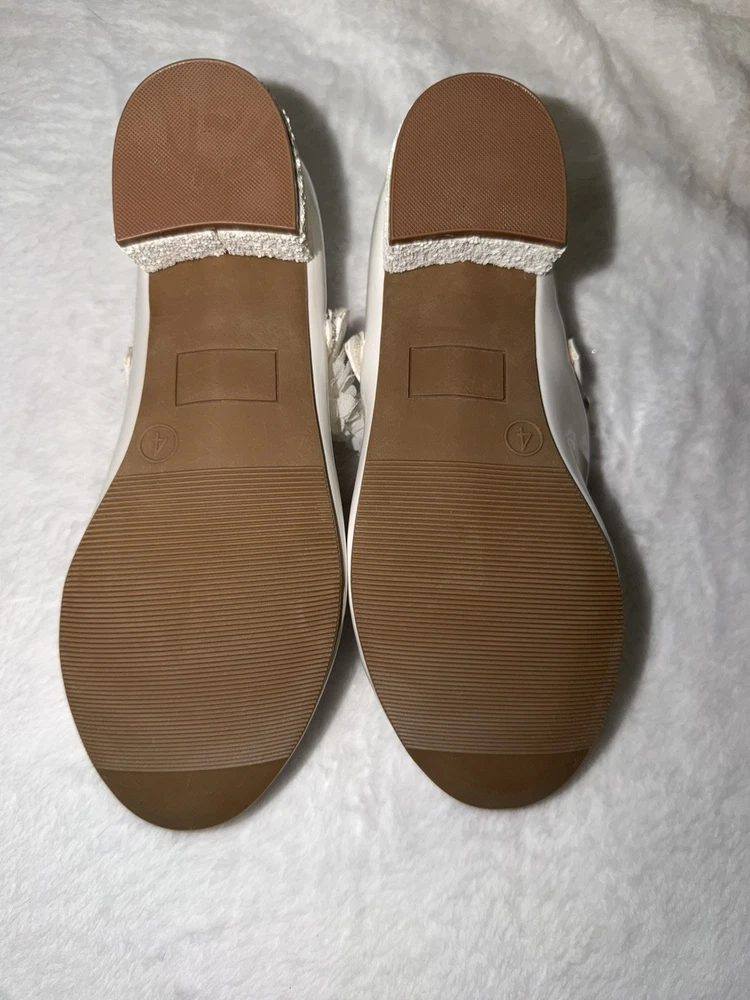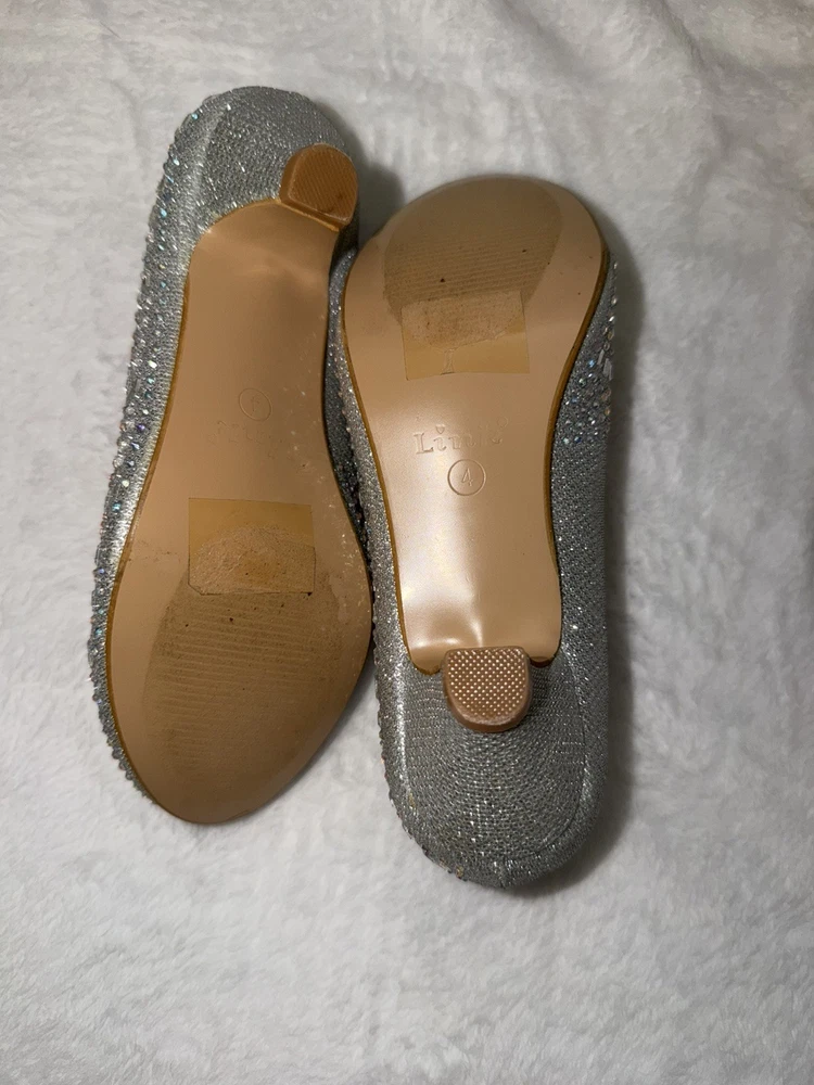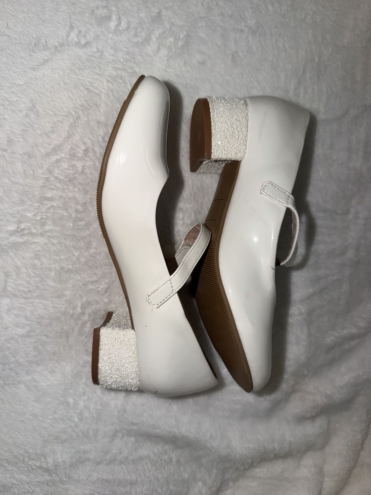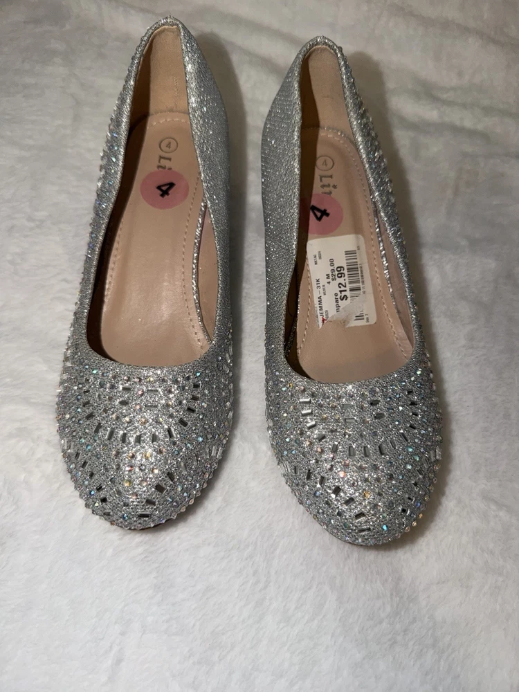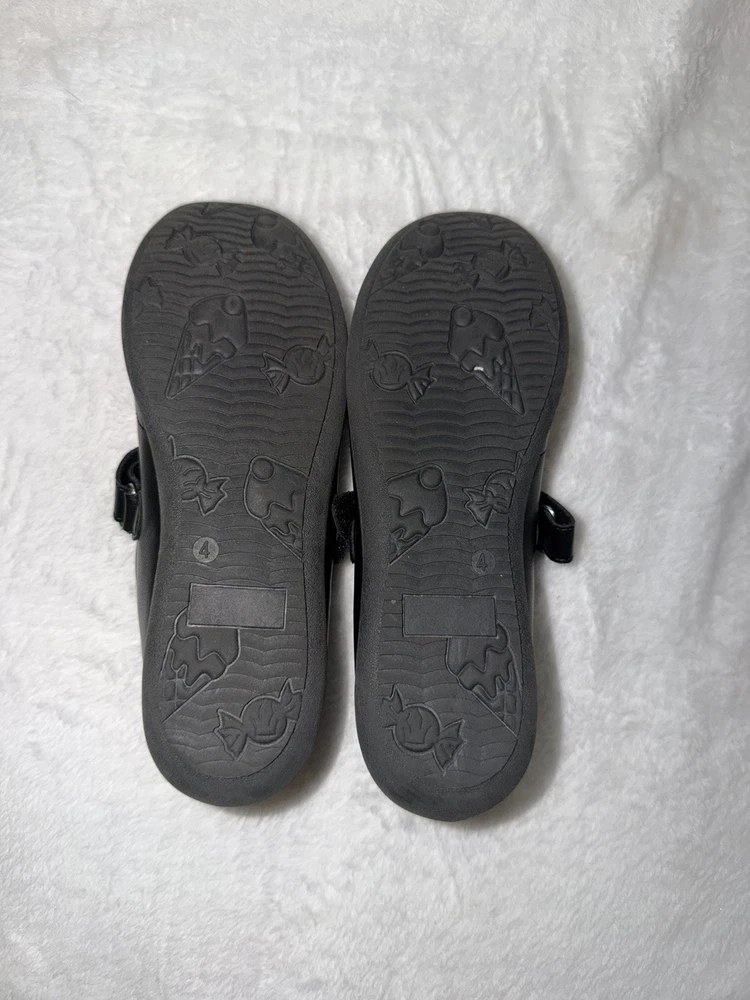 Four pairs of girls dress shoes, size 4. Black leather, patent white, silver and pink. NEVER WORN