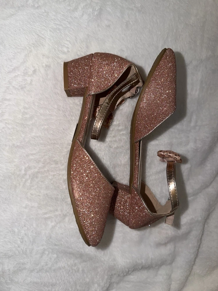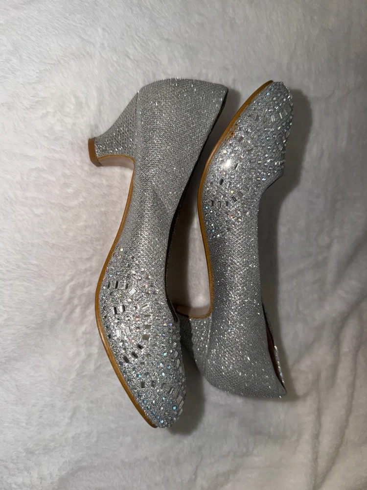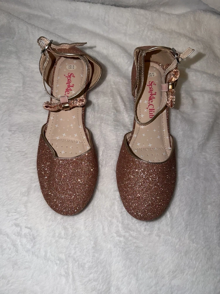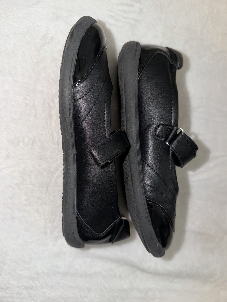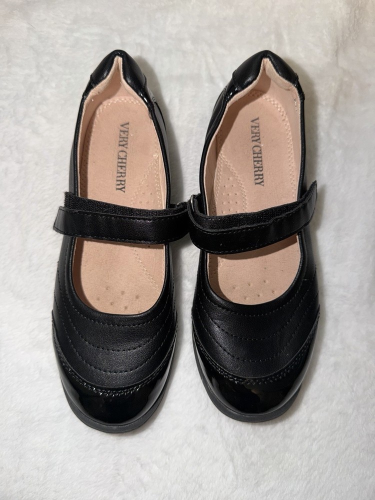 Four pairs of girls dress shoes, size 4. Black leather, patent white, silver and pink. NEVER WORN