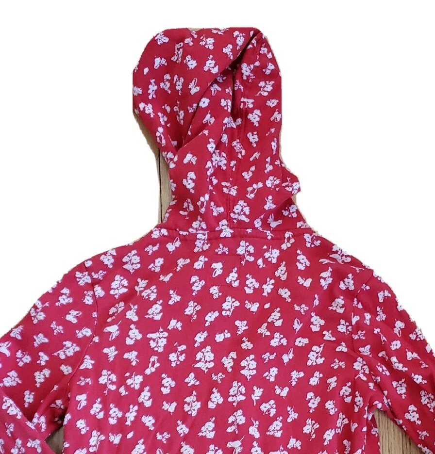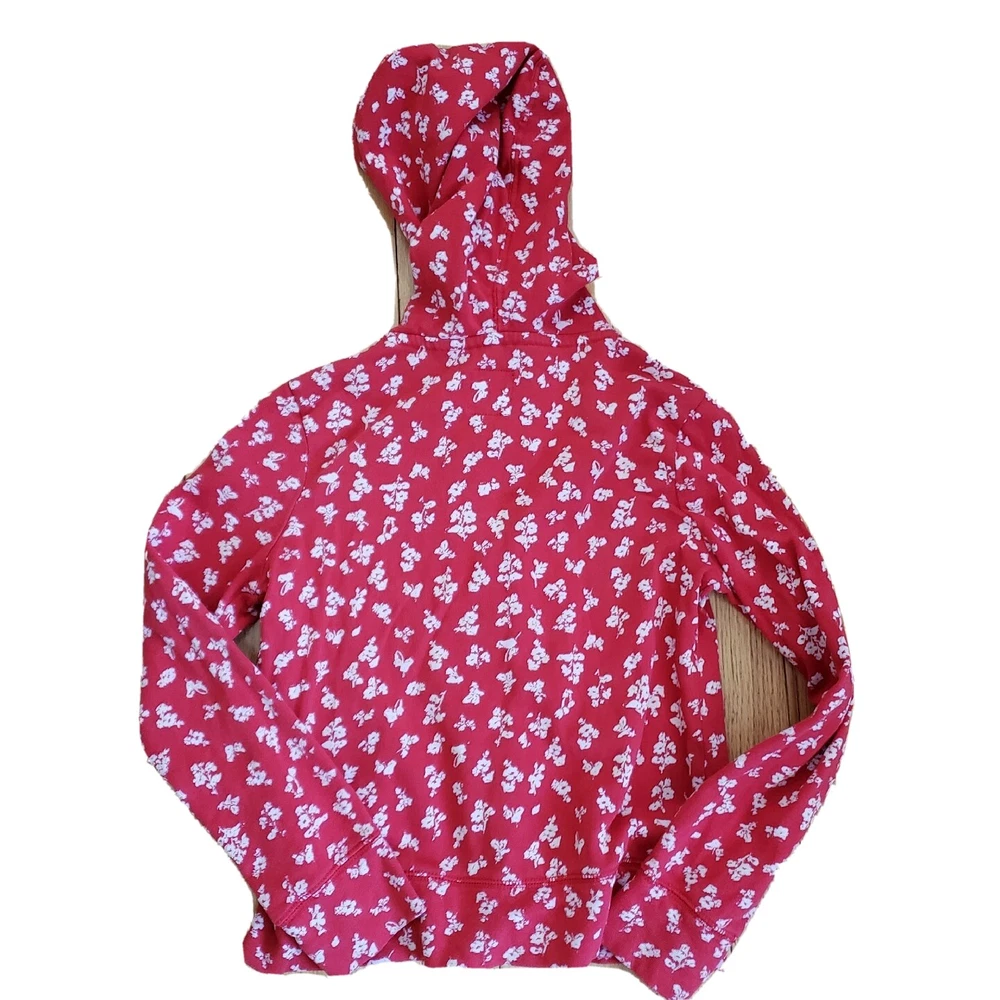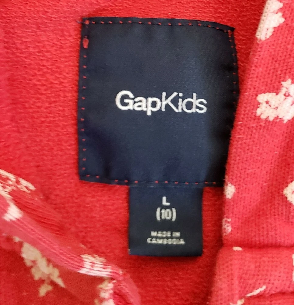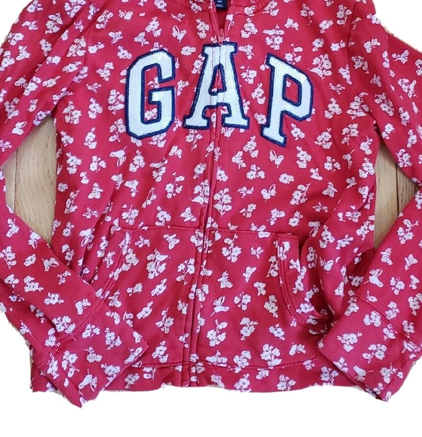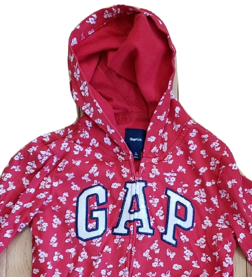 Girls Gap zip up hoodie Good pre-owned condition Red and white floral print hoodie with "GAP" spelled out in sequins in front 100% cotton Marked a size L 10-11 Approximate measurements 16 inches from armpit to armpit 18.5 inches in length from top of shoulder to bottom of hem