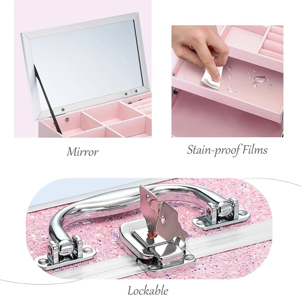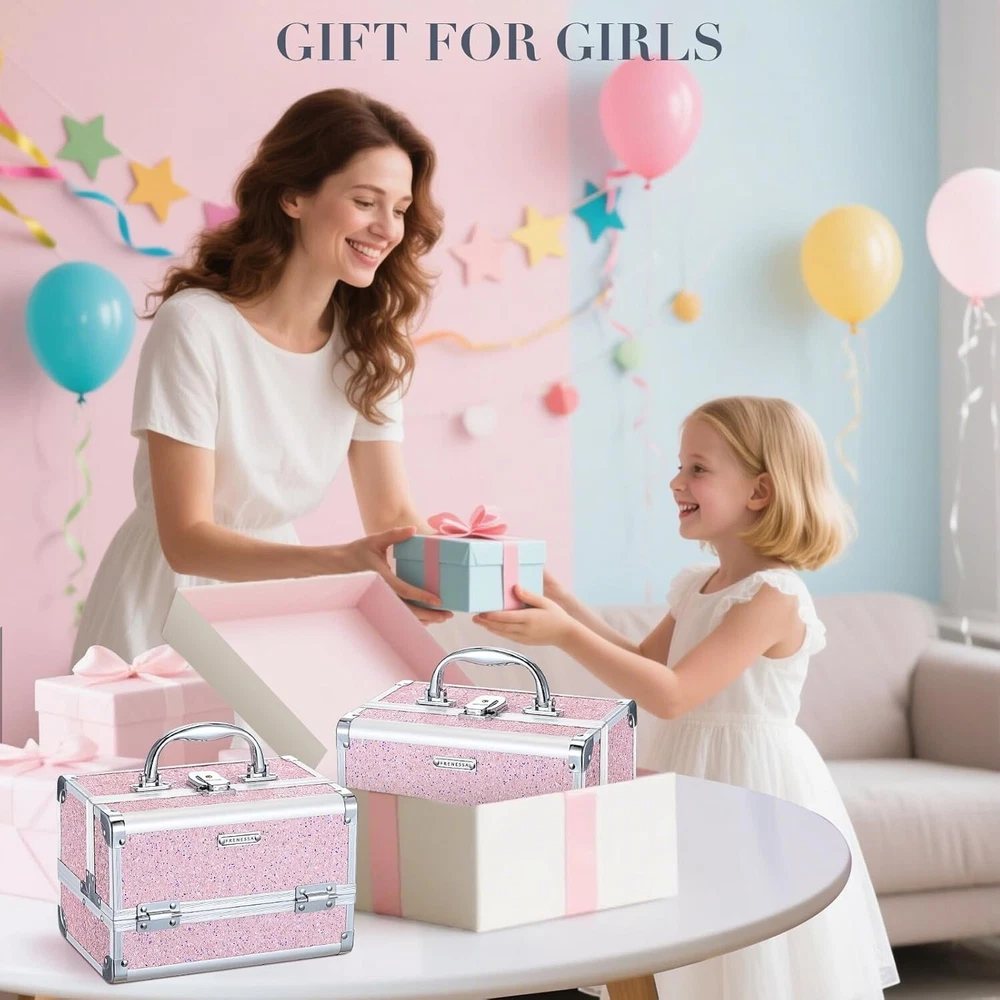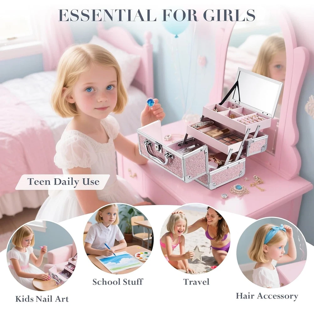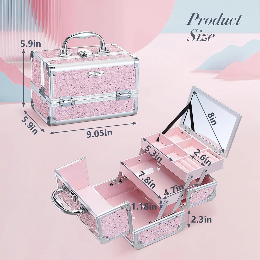 Girls' Shiny Pink Makeup Organizer - Portable, Lockable with Mirror & Trays