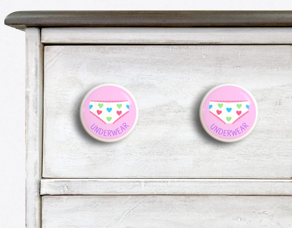 Girls Underwear Dresserz Organizational Knobs Set of 2 New $ 18.99 This great Dresserz Drawer Knob Set ships for FREE! DESCRIPTION NEW Set of 2 Girls Underwear Knobs. Each Measures a large 2 in Diameter. Comes with Screws for Easy Install. White Ceramic. Made in USA in our Studio! Ships for FREE! About our Dresserz Knobs... Dresserz are ceramic replacement drawer knobs that are used for organizing kids dressers. Each Dresserz Knob is ceramic and comes with a replacement screw for easy installation. Just unscrew your existing drawer knob and replace with your new Dresserz knob. Dresserz are a great way to help your kid find (or even put away) their own clothes using simple fun graphics. We have individual Dresserz, Sets of two Dresserz and Dresserz Assortments too! PAYMENT INFORMATION We gladly accept Paypal and major credit cards. We allow up to 7 days for payment. After that time, we have to report all non-paying buyers to eBay so that we are not charged the fees from the sale. Please contact us if you wish to use another form of payment. RETURN POLICY We DO NOT accept returns on personalized products. We will replace if the item arrives damaged. If the item is defective please notify us immediately. Please read the description carefully and if you have any questions, please ask! SHIPPING INFORMATION All items are shipped Monday - Friday excluding holidays. We try to ship within 3-5 business days. Standard shipping is free, if you are interested in expedited shipping please contact us. FEEDBACK POLICY We love feedback and we love leaving feedback! If you have an issue with any item, please contact us so we can make things right before leaving a review - we want you to be happy!