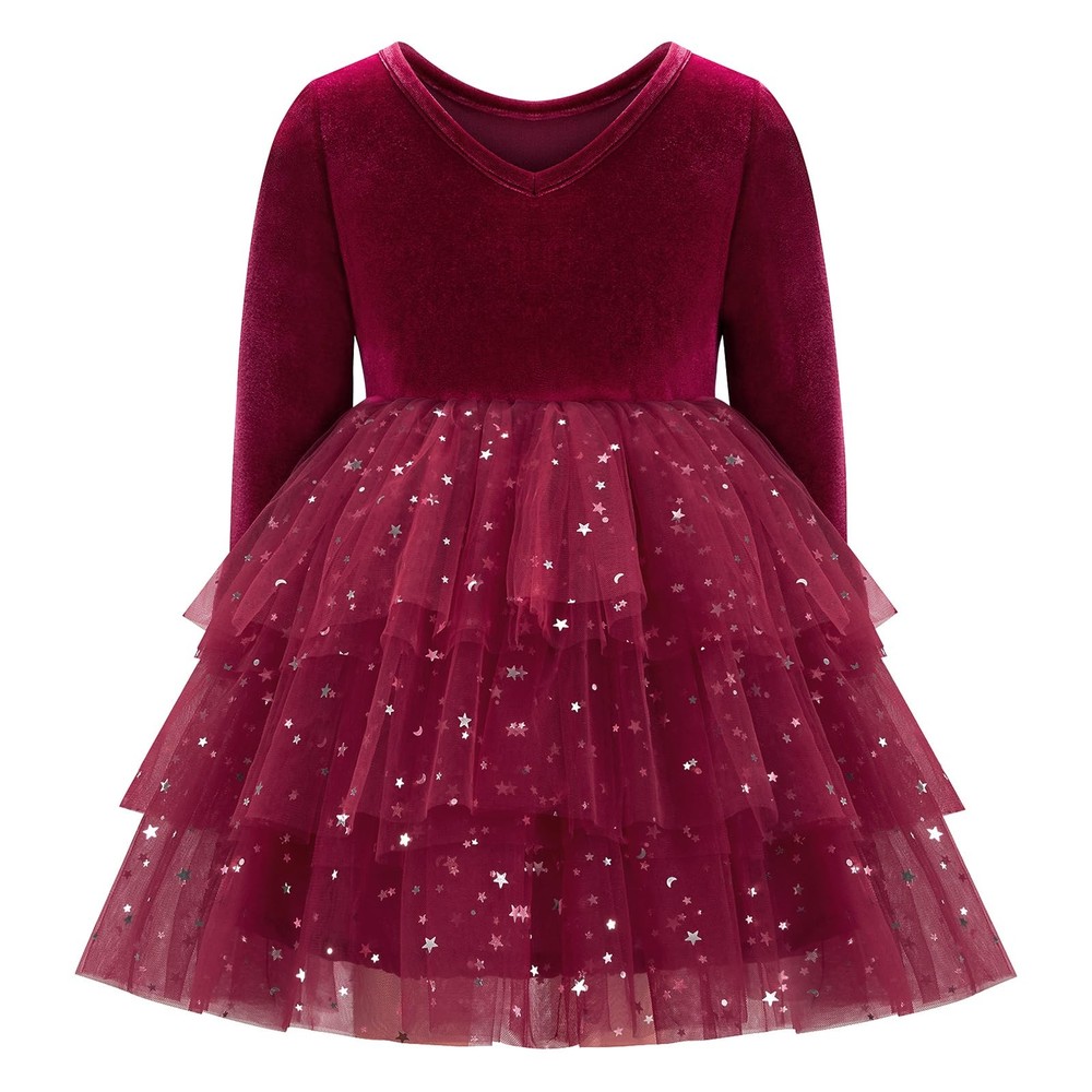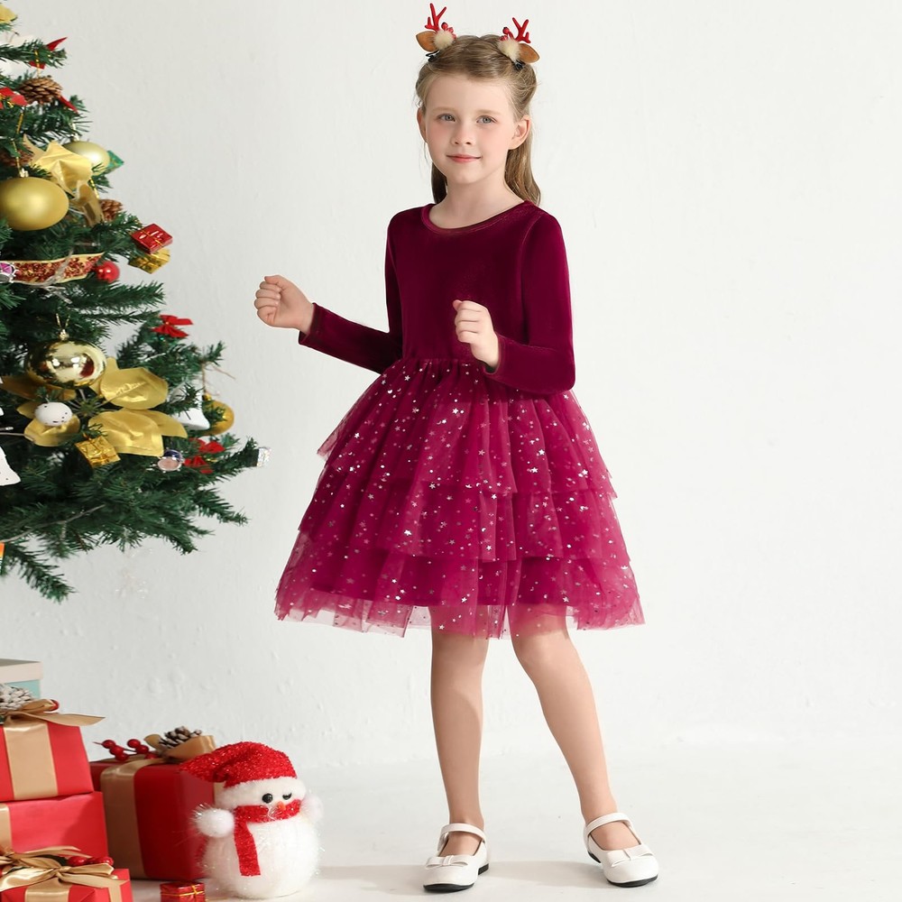 Girls Velvet Dress Fall Winter Clothes Long Sleeve Sequin Tulle Tutu Twirl Party Dresses for Baby Girls Material:girl dress are made with smooth velvet fabric,light-weight and breathable,skin-friendly and soft.The delicate long sleeve princess dresses,warm for spring fall winter.Use a laundry bag machine or hand wash to increase the durability of your dress. Design:girls twirl tutu tulle dress,featuring with delicate V-neck back,solid plain,pullover round collar,knee length.Girls velvet dress with 3 layers tiered tulle and 1 layer breathable cotton,printed the shiny star moon sequinson on multi layers tulle tutu dress hem.The lovely rainbow dress,pink tulle dress are perfect for the party,classic red,green,burgundy dress for girls Christmas and New years. Occasion:Unique girls fluffy tiered fall dress suitable for daily wear,party,photography,vacation,dace party,New Year Day,princess,shooting,family gathering.Great as baby girls Christmas dress,baby birthday dress,baby casual holiday dress,tea party dresses for girls. Size:The fall winter long sleeve girls dress suits for 12M-7T baby girls.2t baby girl dress,3t little girl dresses,fall girl clothes,girls velvet dress winter. Pack List: 1x Baby Girls Velvet Tulle Dress.