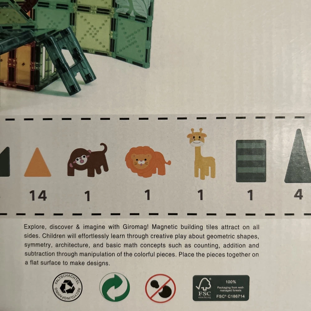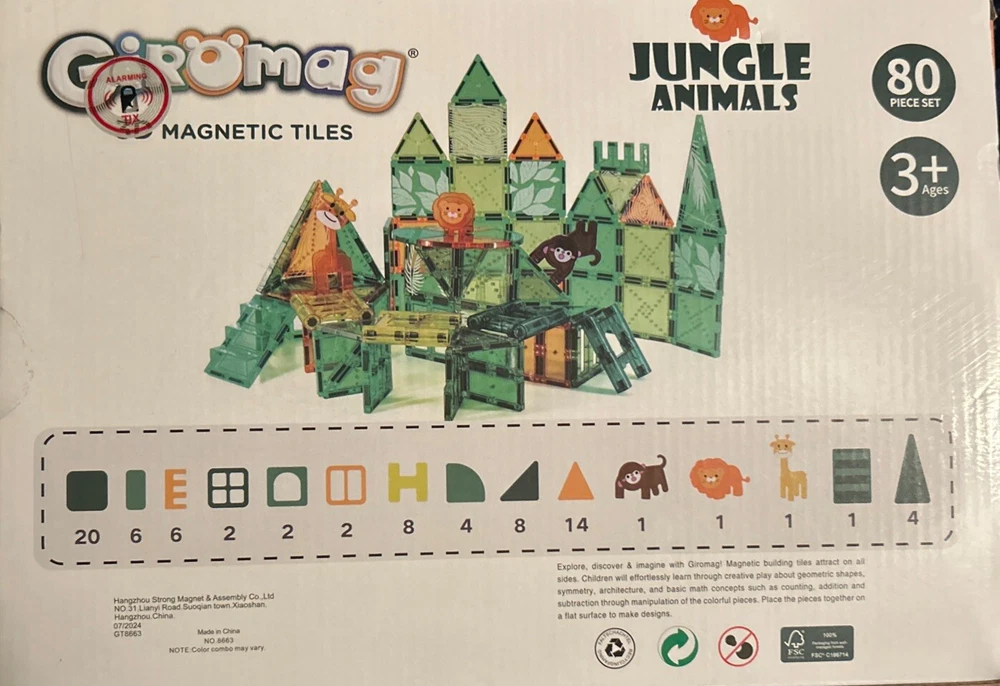 80pcs Magnetic Building Tiles Jungle Set - Giromag magnetic tiles Jungle set has a variety of shapes to create more 2D plane shapes, 3D geometric structures. Kids will enjoy hours of building games. Recommended for Ages 3+. LEARNING BY PLAYING - Magnetic blocks Jungle sets add new magnetic Jungle animals figure, magnetic tiles with prints to simulate realistic scenes to a greater extent which can develop kids imagination, creativity, motor, social and thinking skills. STRONG MAGNETISM - Each of magnetic building blocks are made of permanent magnet material, has strong and stable magnetic energy. Makes building projects easier and faster while doesn’t collapse easily. MORE SAFETY - Made of superior non-toxic ABS material, has round edges, firmly glued and reinforced for added durability, and passed the 4000 anti-throw tests to ensure safety and smooth handing, prevent broken.