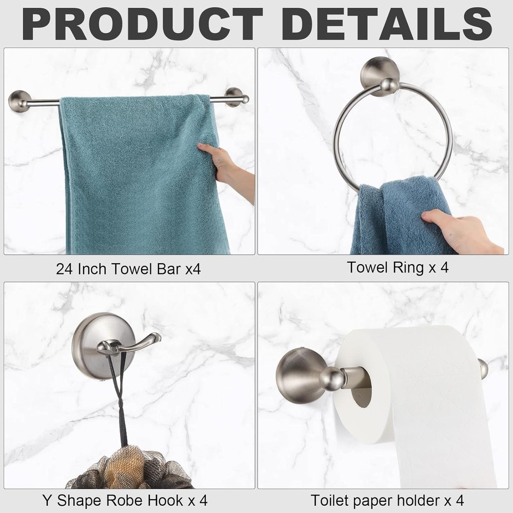Gisafai 16 Pcs Bathroom Hardware Accessories Set Adjustable Expandable Silver Product Details Color: Silver Material: Zinc alloy, Stainless Steel, ABS roller Product Dimensions: 6.69"L x 6.29"W x 24.21"H Finish Type: Brushed Brand: Gisafai Installation Type: Screw-In Shape: Round, Straight, T-Shape Manufacturer: Gisafai Item Weight: 6.93 pounds Country of Origin: China Item model number: Gisafai-2S-A Multifunctional Complete Set: 16 pcs bathroom hardware kit includes 4 pcs of 24 inch tower bar, 4 pcs of towel ring, 4 pcs of toilet paper holder, 4 pcs of Y shape robe hook, make your bathroom remodel easy; The spring toilet paper holder can easily prevent the tissue roll from spinning and falling; The wall hook and round hand towel ring can be applied to hang various kinds of stuff in different rooms; Towel ring can be rotated at 180 degrees Modern and Safe Design: the intimate design of the two ends closed paper towel rack can avoid the toilet paper fallen; Our towel racks for bathroom is suitable for humid environments such as bathrooms and kitchens; Each piece of this towel holder for bathroom wall has been finely polished ensure the surface is smooth, chamfering edges, and would not stab you or damage your towel, protect your body or clothes from scratching Quality Material: towel bar set constructed of quality stainless steel and zinc alloy; Brushed silver bathroom hardware set has resisted scratches, corrosion, rust and tarnishing for durability and reliability; Keep the surface spotless with maximal maintenance, save energy and time on daily cleaning; Max weight capacities range from 11-22 Lbs Easy to Install: our bathroom towel rack set comes with all mounting hardware pack and detailed installation instructions; This bath set towel bar, towel ring and toilet paper holder are concealed screw mount, wall mount, firmly attached to the wall; You can easily nail it Ideal for use in bedrooms, kitchen, bathrooms, laundry room, patio and spas Smooth Surface: concealed screw design makes the product look beautiful and modern, clean lines and contemporary styling, make your bathroom simple and fresh; Brushed hardware set is brushed finish, build to resist daily scratches, corrosion and tarnishing, nicely matches with your fixtures; Specially designed round edges to protect your body from scratches; Safely hang a bathrobe, pants and shirt, bath towel, swimsuits, coats, shower caddy, or other stuff