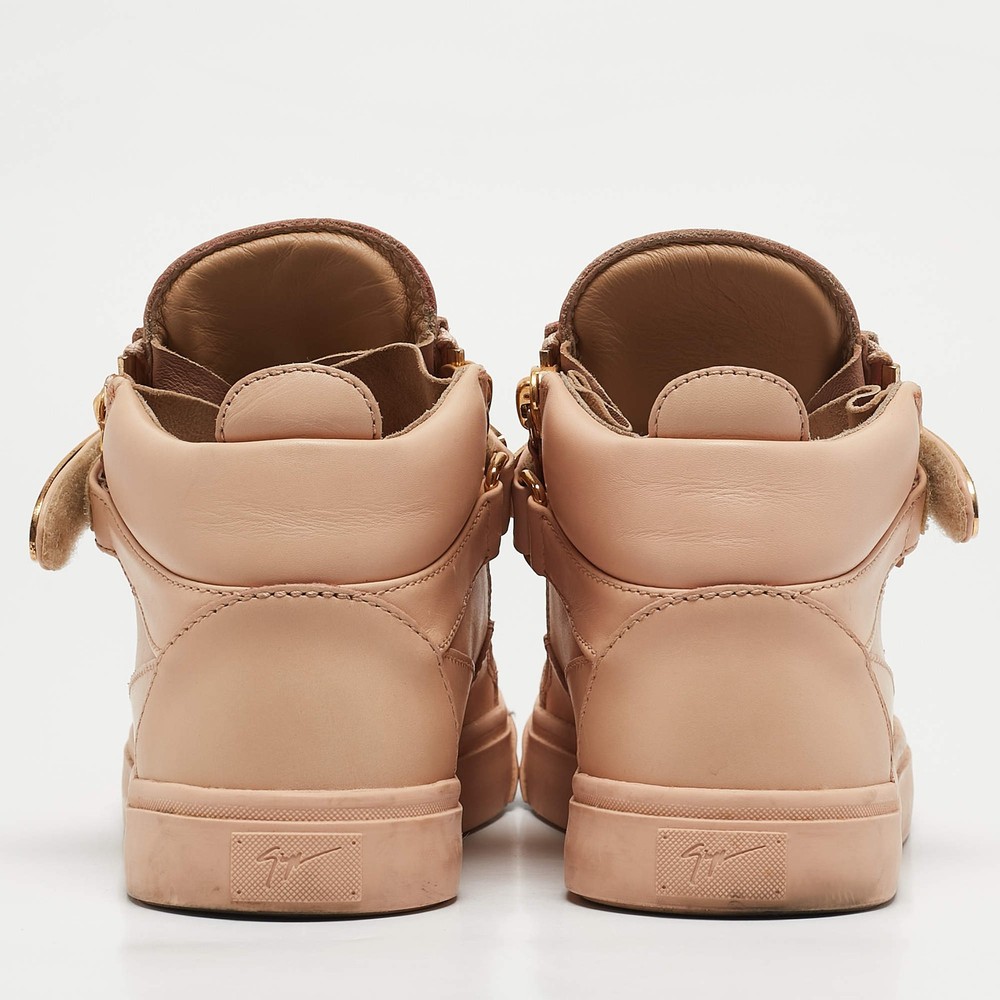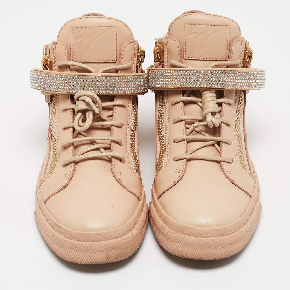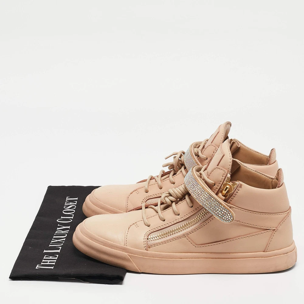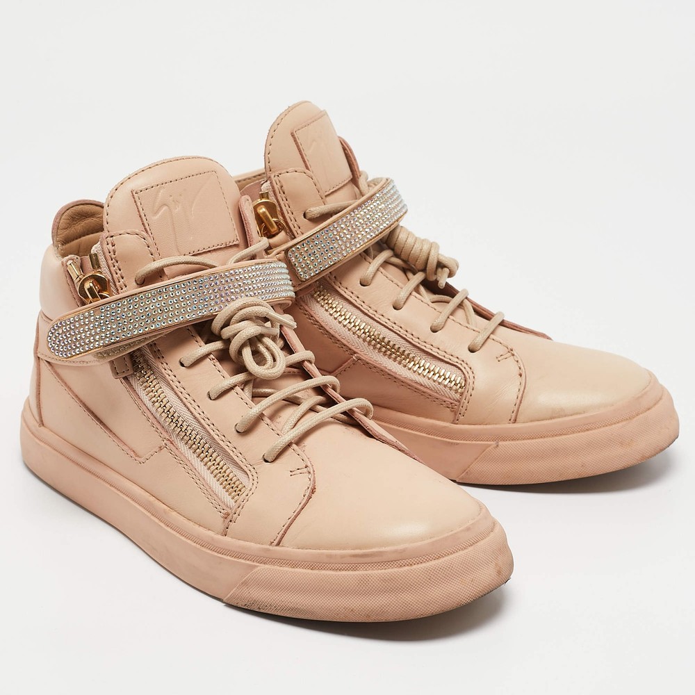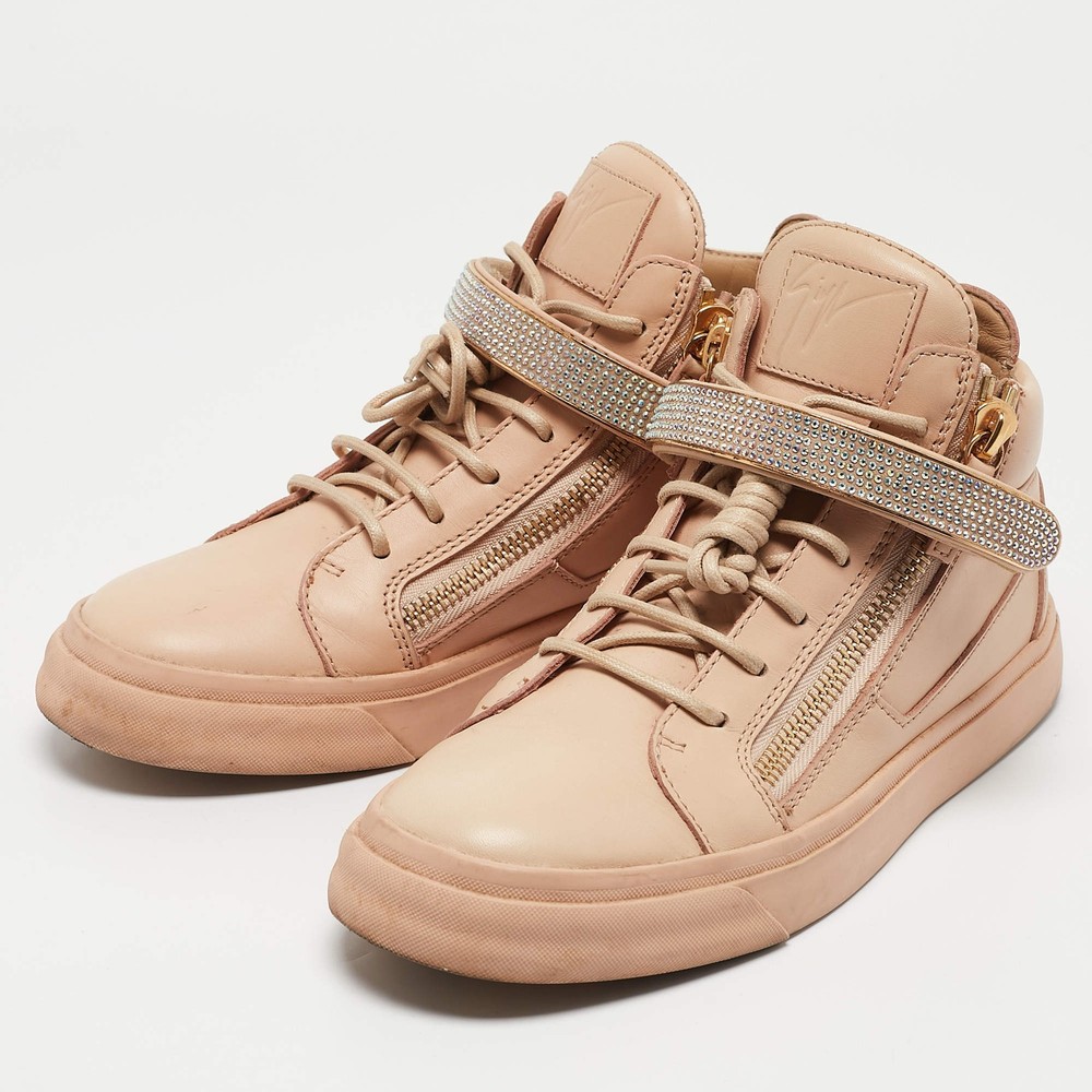 Our eBay Store About Us Contact Us Add to Favorite Sellers Giuseppe Zanotti Beige Leather Crystal Embellished Coby High Top Sneakers Size Giuseppe Zanotti's Coby high-top sneakers in beige leather feature signature zip detailing and a sleek lace-up design. A street-style essential with a touch of luxury. Product Details Brand Giuseppe Zanotti Color Beige Includes The Luxury Closet Packaging Outsole Length 31 cm Outsole Width 12 cm Size 40 Certified by The Luxury Closet This item has gone through a detailed authentication process overseen by our experts. We offer a lifetime guarantee of authenticity on all our items. How We Check The in-house team of experts at The Luxury Closet is highly trained to verify the authenticity and the condition of the luxury products. They ensure that only 100% authentic items are put on sale.The evaluation process is unique with its own mix of assessment criteria and differs according to the category. Each item is evaluated based on the following combination of hallmarks, hardware, stitching, symmetry, material, craftsmanship, stamping, codes, hologram stickers, and packaging. Our authenticators also check if the items have been modified or amended (e.g., aftermarket diamonds, replaced batteries, repaired bags, etc.) International Buyers Import duties, taxes and charges are not included in the item price. These charges are the buyers responsibility. Please check with your country’s customs office to determine what these additional cost will be prior to buying.