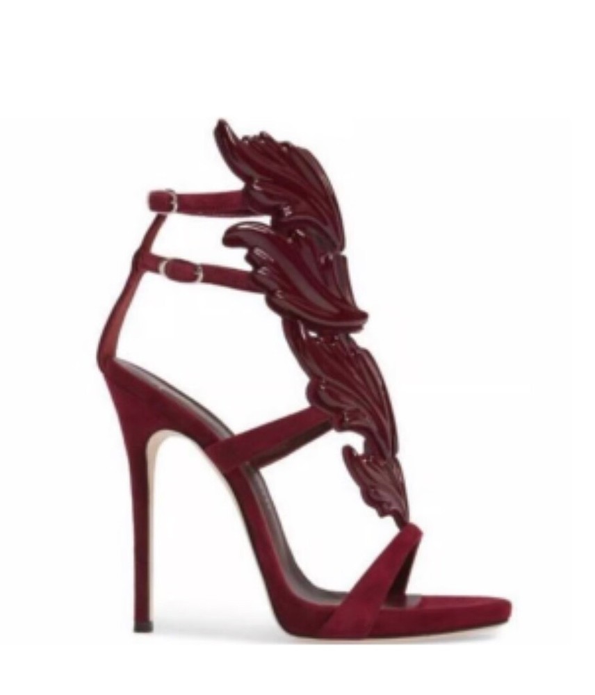 A scene-stealing Italian sandal in an iconic Firewings silhouette and crowned with a dramatic crescendo of polished flames and lifted by a sky-high stiletto heel. Striking a balance between whimsical and edgy, Giuseppe Zanotti's Burgundy cage sandals are armored with sweeping, sculptural wing embellishment for an unforgettable evening look. Heel Style: Stiletto Toe Style: Open Toe 5" heel; 3/4" platform, 4" ankle strap height. Made in Italy. FABRIC / MATERIAL suede upper, leather lining, leather sole FIT TIP Fits true to size.