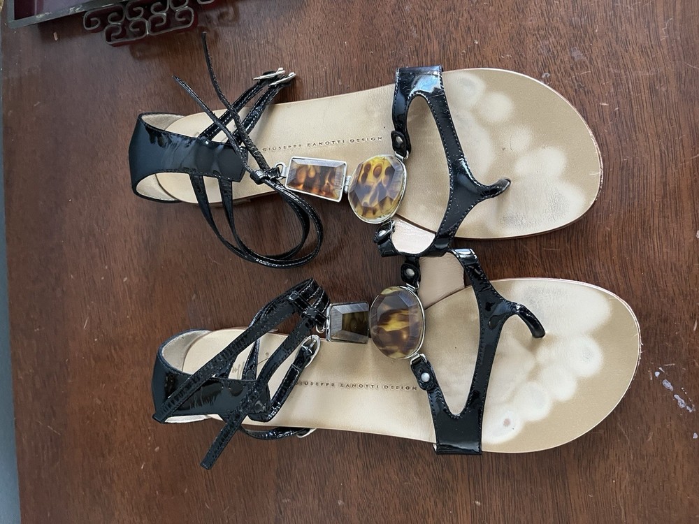 The Giuseppe Zanotti Embellished Strappy Flats Sandals in EU size 39 feature a stylish ankle strap design with embellishments that add a touch of glamour to the solid black color with stone embellishments . These sandals have a flat heel under 1 inch, making them comfortable for all-day wear. Made from leather, they showcase a thong style with straps and buckle closure, perfect for a trendy and fashionable look.