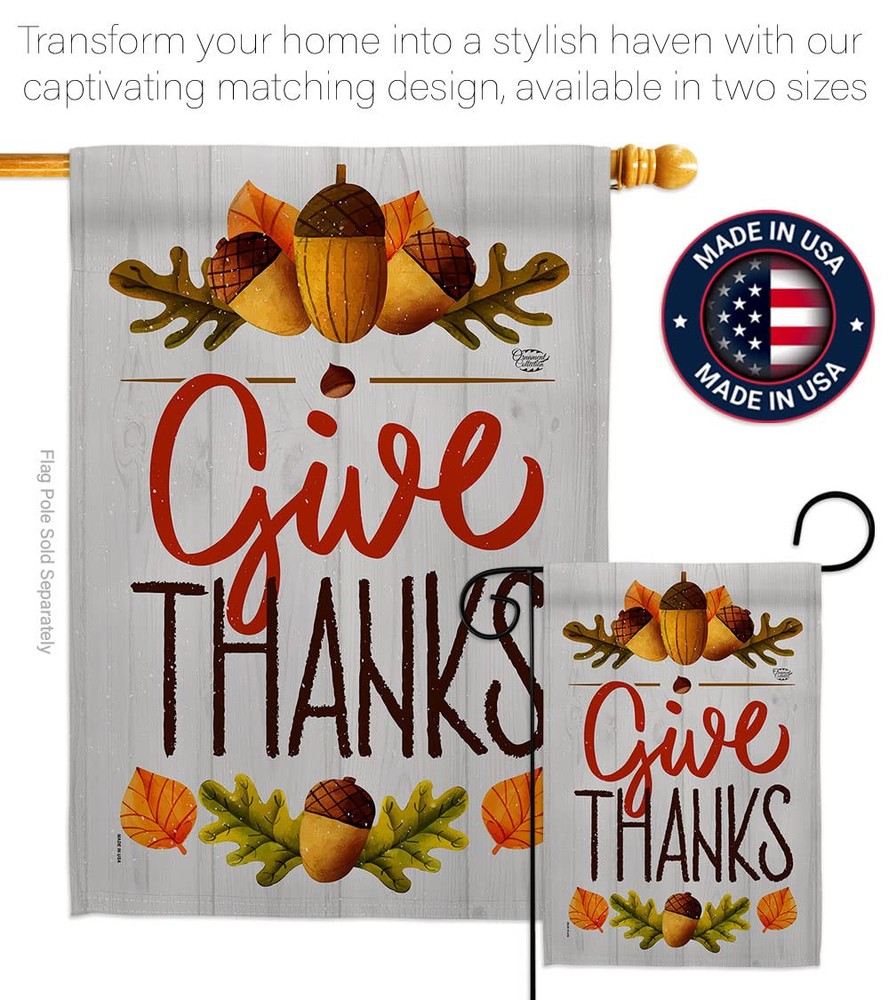Thanksgiving Beautiful Mini Garden Flag with Metal Garden Banner Pole Stand - Complete Set with Garden Pole - 16" x 40" Power Coated Metal Flag Stand have variety of Garden Flag Set for all occasions. Uniquely design for hanging indoor or outdoor use. We are committed to offering you exceptional values. Our customers enjoy displaying our Garden Flag Set for longer periods. Specification: Theme: Thanksgiving Size: Garden Flag Set 13" x 18.5" Size: Metal Garden Pole Print: Double-Sided Readable: Readable Both Sides Material: Weather Resistant 3 Layers Blockout Stitching: Double Stitched Display: Vertical Hang Type: Sleeve Artist: © Megan Tanaka Special Features: Origin: Made In USA Package Include: 1 pc x Mini Garden Flag 13" x 18.5" 1 pc x Metal Yard Banner Hardware For more than a decade, we’ve been dedicated to manufacturing flags with no comparison in quality and beautiful designs. Our flags are made with our Guard material that is soft to the touch and designs can be read correctly on the flag. A feature that our customers will love. We are committed to using eco-friendly inks that won’t leave a foot print in our environment. MPN: OC-TG-GS-192137-IP-BO-D-US18-OC 92137 92137