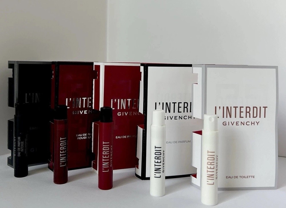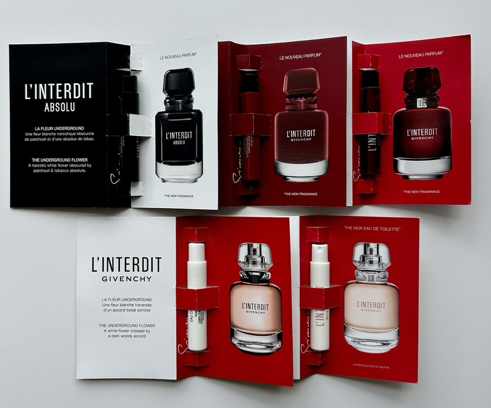 Givenchy L’Interdit Perfume Collection Sample Spray Vials 5pc Set •Included: - Givenchy L'Interdit EDP ROUGE ULTIME Sample Spray 1ml *NEW* - Givenchy L'Interdit EDP ROUGE Sample Spray 1ml - Givenchy L'Interdit EDP Sample Spray 1ml - Givenchy L'Interdit EDT Sample Spray 1ml - Givenchy L’Interdit Absolu 1ml