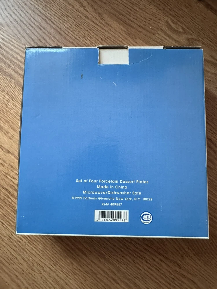 Givenchy Set 4 Porcelain Dessert Plates New Original Box Vintage 1999 Floral 25 years old and never used, still in original box. Brand new. Elegant designer, dessert plates or display plates. Absolutely gorgeous. Box shows wear from storage.