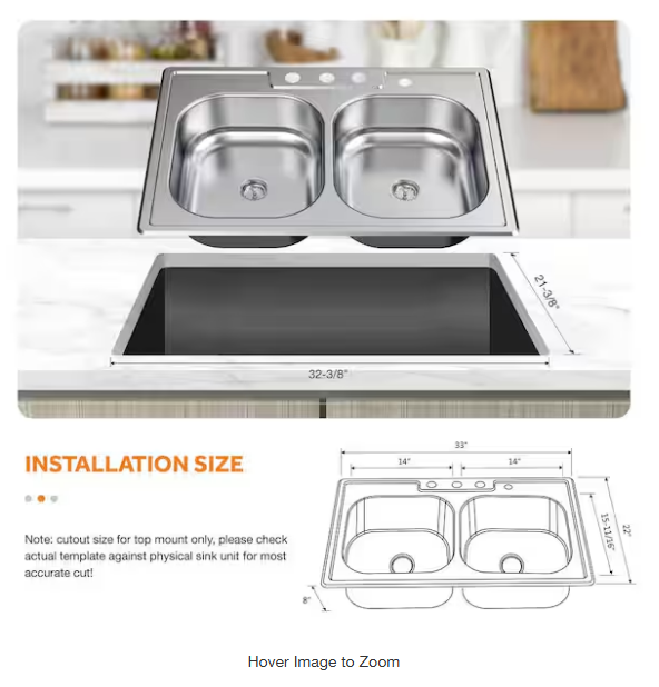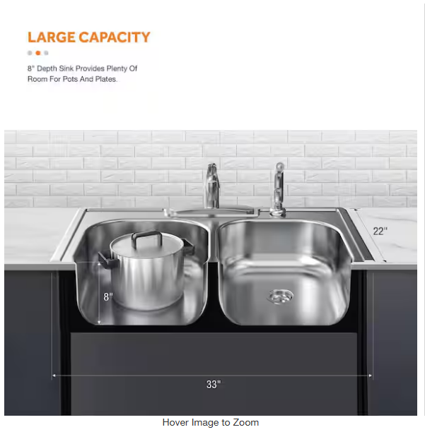 About This Product Top mount all-in-1 33 in. x 22 in. double bowl kitchen sink features 2 generous basins of equal size to allow for multiple uses at once to help you maximize your workspace. The thick, durable stainless steel has a satin finish for added durability to withstand repeated use. Each basin is fully undercoated to reduce noise and condensation and to maintain water temperature in the sink to keep dishwater warm. For added convenience, pre-drilled faucet holes are ready to accept the faucet included with the sink. Highlights Top mount design for easy installation Double basin design provides ample room for dishes or space to wash fruits and vegetables 4-pre-drilled faucet holes accommodate the included single-handle faucet Deadening pads prevent condensation and drastically reduce noise caused by dishes or running water Includes faucet and sprayer Brushed stainless steel Durable 20-gauge stainless steel with a long-lasting satin finish Top-mount clips will fit countertop thicknesses of 0.47 in. - 1.5 in. With a quick install screwdriver for installing sink Return Policy California residents see Prop 65 WARNINGS Product Information Internet # 323052494 Model # VT3322A08SHA1-2 Store SKU # 1008832285
