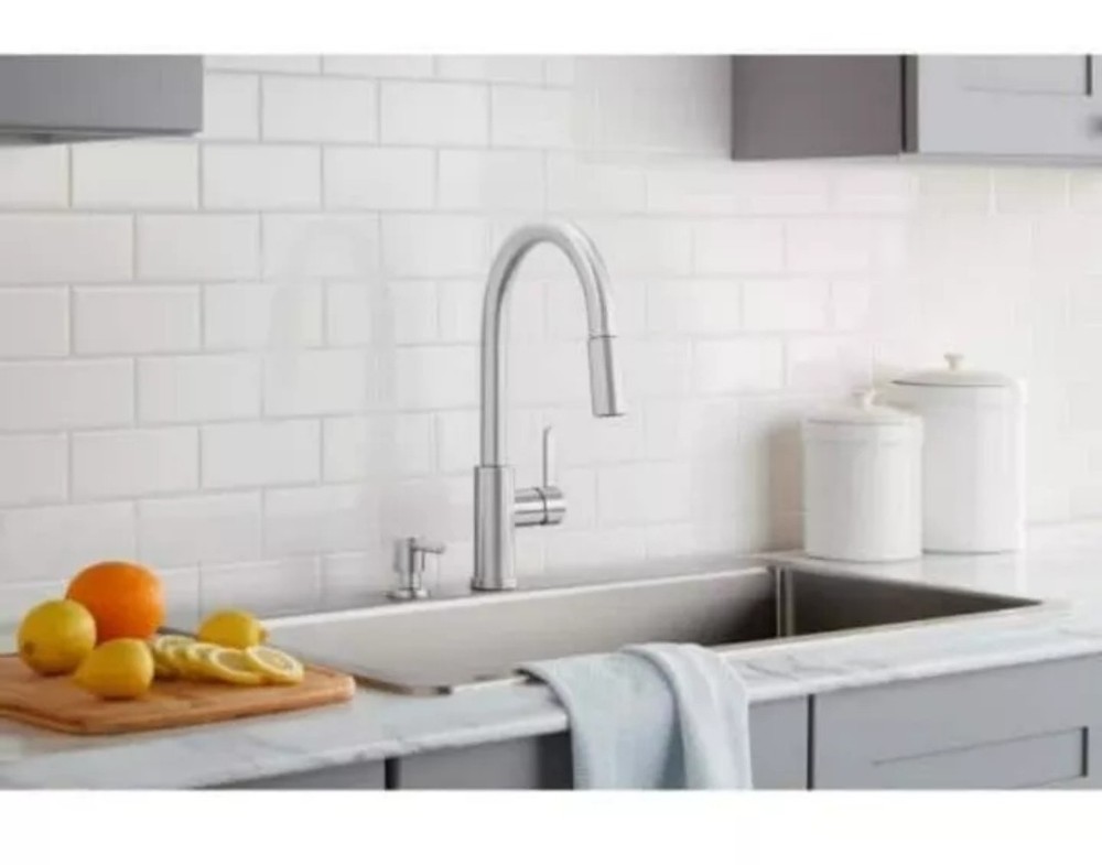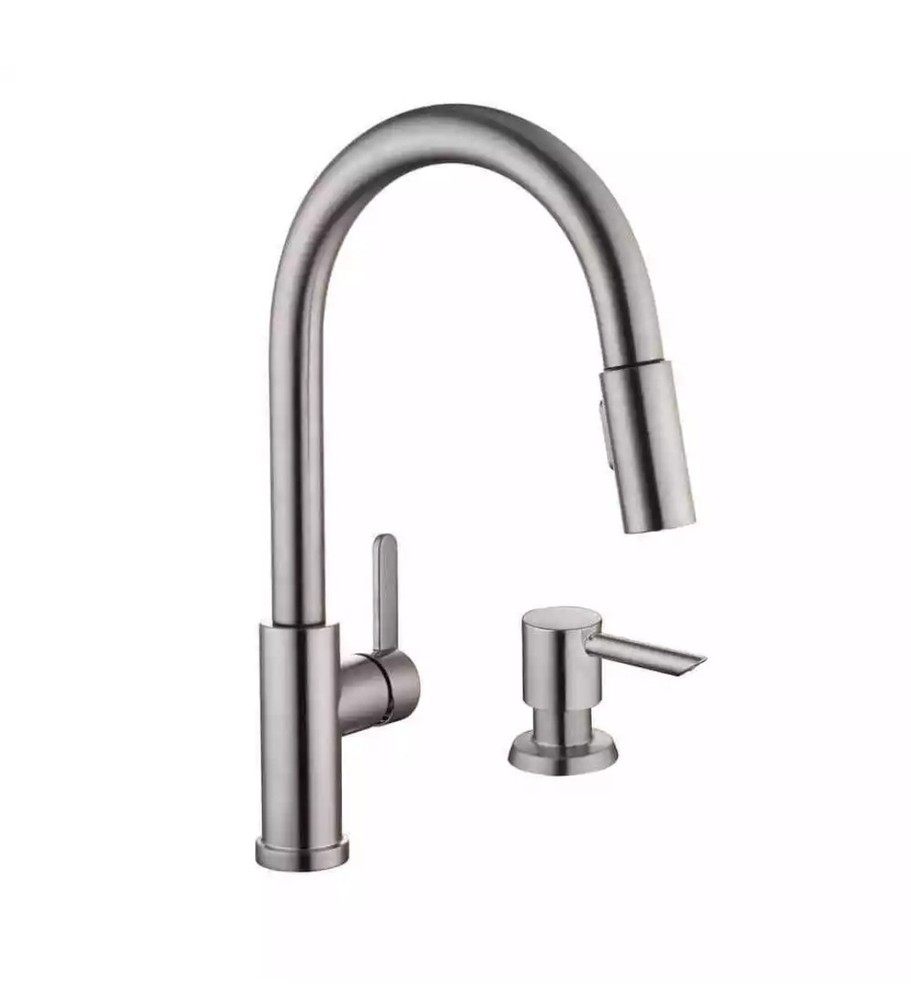 The Glacier Bay Paulina 1-Handle Pull-Down Sprayer Kitchen Faucet in Stainless Steel is a stylish and functional kitchen fixture suitable for kitchen sinks. This high-arc faucet features a lever handle, a 1.8 GPM flow rate, and a pull-out sprayer for added versatility. The package includes a soap dispenser and deckplate, making installation easier with the FastMount mounting system. With a sleek satin finish and farmhouse style, this Glacier Bay kitchen faucet is a modern addition to any kitchen.