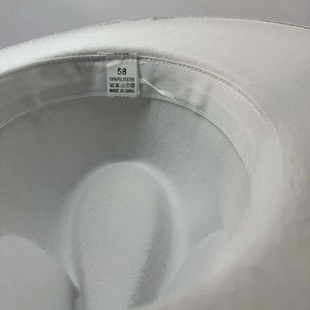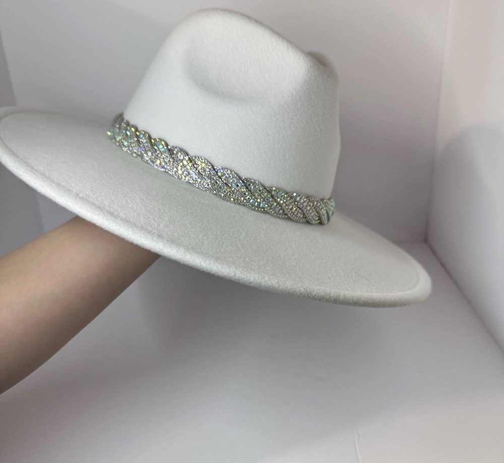 Gorgeous white wool wide-brim hat with a sparkling silver rhinestone braided band. Structured fit that works for glam western, dressy nights out, bachelorette, engagement, bride, or special events. No rips, dents, or stains. Rhinestones all present. Interior sweatband is clean. Statement piece ready to elevate any outfit. Ships fast from a smoke-free home. Add some bling to your wardrobe with this stunning white cowboy hat! Covered in sparkling rhinestones and featuring a wide brim, this hat is perfect for any glamorous occasion. Whether you're attending a wedding, party, or even a casual event, this hat is sure to make a statement. The hat is made of 100% polyester and is designed to fit most with its one size feature. Its structured design and clean interior make it comfortable to wear while its lightweight material ensures it won't weigh you down. The hat's solid pattern and glitter accents make it perfect for any bride, cowgirl, or jazz-inspired look.
