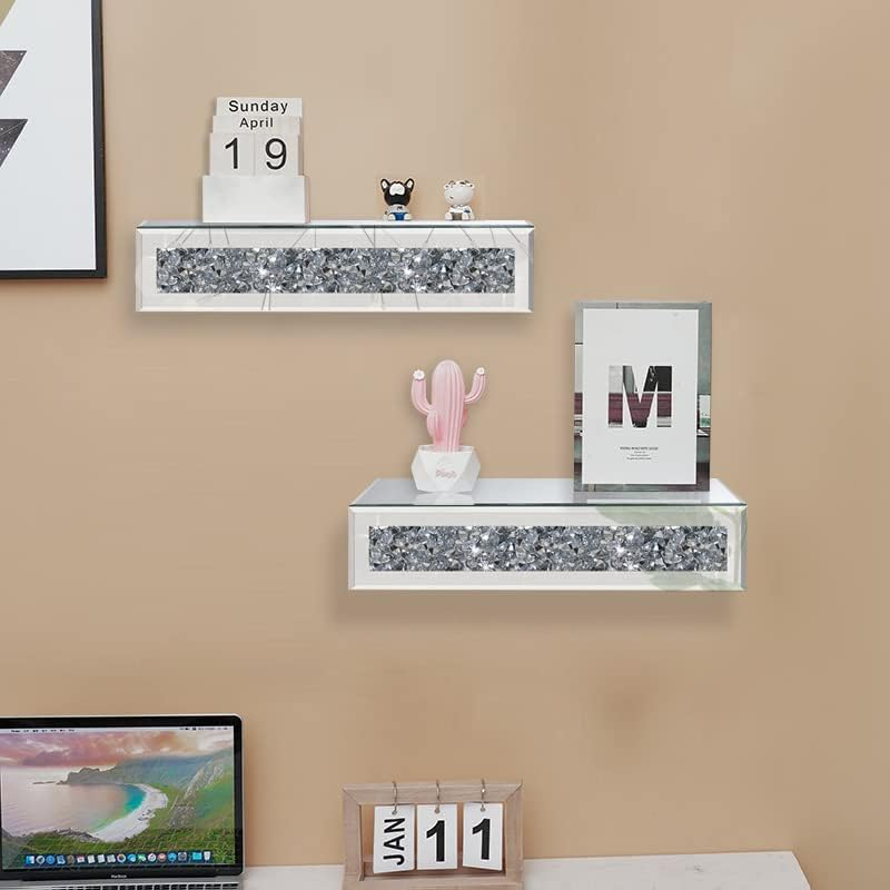 This floating wall shelf is a total showstopper! The crushed diamond crystals sparkle beautifully, instantly upgrading any room. It's sturdy, easy to mount, and the mirrored glass makes my decor pop—perfect for displaying perfumes, framed photos, or small decor pieces. Modern yet elegant, it adds a luxe touch to my bedroom. Love the sleek design and how it catches the light. Highly recommend for anyone wanting a chic, space-saving display!