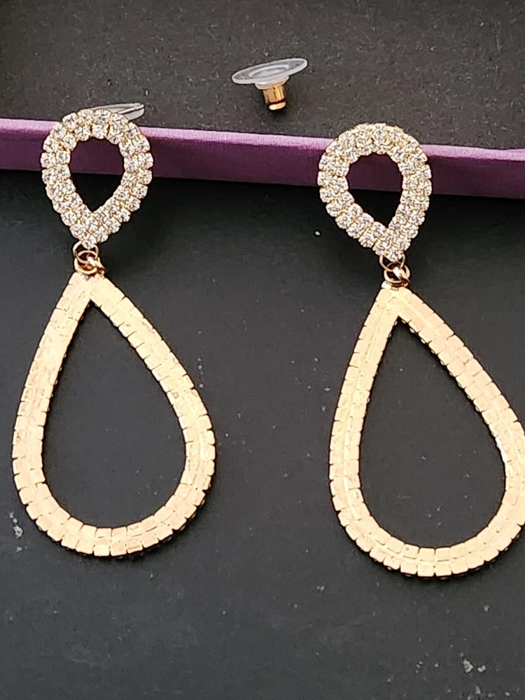 Make a stunning entrance with these glamorous drop earrings. Featuring a dazzling rhinestone stud and a sleek, golden teardrop silhouette, these earrings are the perfect blend of sparkle and sophistication. Ideal for dressing up any outfit for special occasions or nights out, they add a touch of elegance and flair to your look. Lightweight and comfortable, these earrings are designed for all-day wear while you shine bright. #DropEarrings #StatementJewelry #GlamorousStyle #FashionAccessories #SparkleAndShine #EveningWear #GiftIdeas