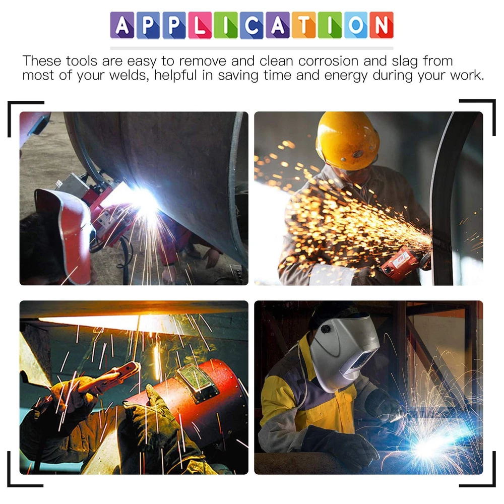 Glarks 4Pcs 10'' Welding Chipping Hammer with Coil Spring Handle and Wire Brush with a Pair Welding Gloves for Removing Slag and Welding Residue Specification Product Type: Welding cleaning tools Welding Chipping Hammer Width: 5 inch (12.5cm) Overall Length of The Hammer: 10 inch (25.5cm) Brush Wire Length: 4.3 inch (11cm) Overall Length of The Brush: 10 inch (25.5cm) Package Detail Welding chipping hammer x 1pc Wire scratch brush x 1pc Leather forge welding glove x 2pcs Total Quantity: 4Pcs Why Choose Us? ☀ We provide you with a complete welding cleaning kit, it can help you complete the entire cleaning process. ☀ A flat chisel on the one endand and the pointed chisel on the other end, which is convenient for using under different conditions. ☀ There is black layer on the surface of the hammer, more wear-resistant and greatly improves its service life. ☀ The gloves in the suit are made of leather and have extremely high abrasion resistance. Not only can they be used for welding, but also can be used in barbecues, trimming flowers or camping. ♚ [What You Get]: This set includes a 10 inch welding chipping hammer, a wire scratch bush and a pair of welding protective gloves, 4pcs in total. With this powerful set, you can quickly remove rust and slag during welding and keep your work clean. ♚ [Welding Chipping Hammer]: The welding chipping hammer is made of high strength and toughness steel. Dual-headed design, one end is a flat chisel and the other end is a pointed chisel, which is convenient for working in a small space. The coil spring handle can reduce vibration and improve comfort. ♚ [Wire Scratch Brush]: We use stainless steel bristles to make wire brushes and increase the wire density, so they are not only durable but also have a strong cleaning ability. The brush is 10 inches long, the appropriate size and wooden handle make it easier for grasping. ♚ [Welding Gloves]: Wear-resistant welding gloves protect your hands at all times. The gloves are made of soft leather, resistant to oil, heat and cutting. The proper size also ensures that it will not easily fall off your hands. ♚ [Widely Application]: This set of welding slag removal tools can not only be used for daily welding and cleaning work, the hammer can also be used as a life hammer and ice breaking hammer, and the brush can be used to clean up rust stains on furniture and metal.