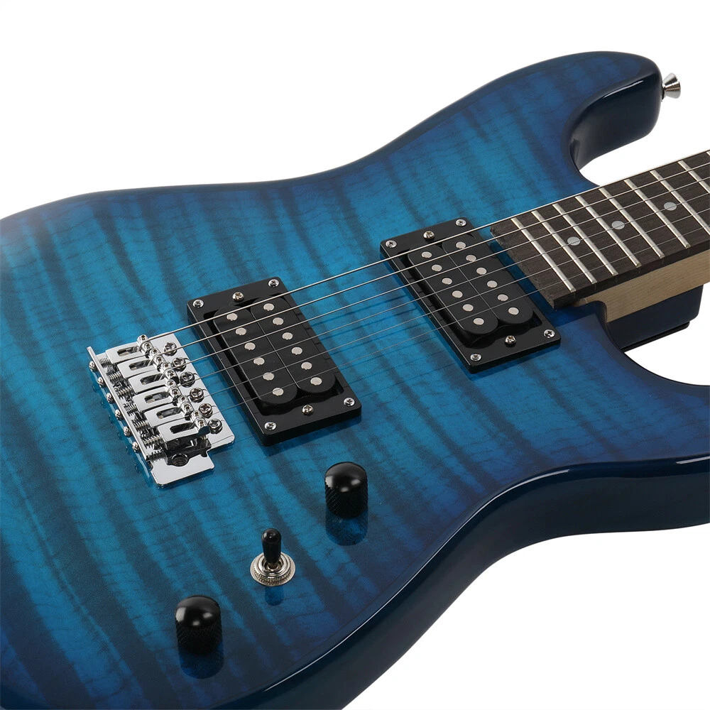 Introductions: Do you fall in love with this Glarry GST Stylish Tiger Stripe Electric Guitar Kit with Black Pickguard the first sight you see it? We offer this electric guitar for its perfect performance, stylish appearance as well as its reasonable price. Designed with a black pickguard, this guitar looks more charming and unique than others. With humanized design and high quality, it is durable to use. What is more, the standard tone from this guitar gives you wonderful audio experience. Featuring comfortable hand feeling and melodious tone quality, this electric guitar will be your regretless choice! Features: 1. H-H Pickup get a deeper, louder and smoother sound compared to cheaper single coil 2. With White pickguard on the surface, this guitar looks cool and could be well protected 3. Comfortable hand feeling, stylish outlook, stable performance and melodious sound 4. A perfect solution for beginners who want to learn to play guitar 5. An addicting instrument that can be taken everywhere 6. This electric guitar throws in incredible value to quickly become a guitar that grabs your attention 7. It has a silky balance to the tone that supports vocals beautifully 8. Best choice for yourself or as a gift for your dear friends 9. It comes with speaker, guitar bag, shoulder strap, plectrum, crank, connecting wire and spanner tool etc 10. 1/4 inch headphone output jack, used for silent practice 11. 1/8 inch auxiliary input jack, used for MP3 player Specifications: 1. Style: Electric Guitar 2. Brand: Glarry 3. Body: • Orientation: Right Handed • Body: Basswood • Color: Blue 4. Neck and Fingerboard • Neck: Maple • Fingerboard: Rosewood • Strings: 6 • Frets: 24 • Nut width: 1.656 in. (42 mm) • Scale Length: 25.5" 5. Pickups & Hardware: • Pickups: Humbucker-Humbucker Pickup • Control: 3 Way Switch; 1 x Volume; 2 x Tone • Hardware: Tremolo • Jack: 1/4" 6. 20W Electric Guitar Amp • Front Panel Controls: Gain,Bass,Treble, Volume, Headphone • Bass Guitar Input: (1/4" Jack) • Headphone output: (1/4" Jack, Speaker defeating) • Dimensions: 29*27*11.3cm • Weight: 3.0 kg • Speaker Size: 8.5 inch • Impedance: 4Ω • Auxiliary input jack (MP3): 1/8 inch 7. Dimensions • Guitar Dimensions: (39.17 x 12.99 x 2.36)" / (100 x 33 x 6)cm (L x W x H) • Gutiar Weight: 6.3kg / 13.89lbs Package Includes: 1 x Electric Guitar 1 x 20W Electric Guitar AMP 1 x Electric Guitar Bag 1 x Guitar Strap 1 x Tremolo Arm 1 x Amp Wire 1 x Wrench Tool 1 x Amp Wire 1 x Wrench Tool Warm Note:WARNING USE OF SPEAKERS: TO REDUCE THE RISK OF FIRE OR ELECTRIC SHOCK DO NOT EXPOSE TO RAIN OR MOISTURE INDOOR USE ONLY, AND PLEASEl UNPLUG THE SOCKET IMMEDIATELY WHEN THE SPEAKER IS NOT IN USE. RISK OF ELECTRIC SHOCK DO NOT OPEN