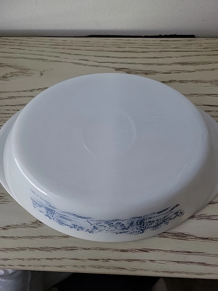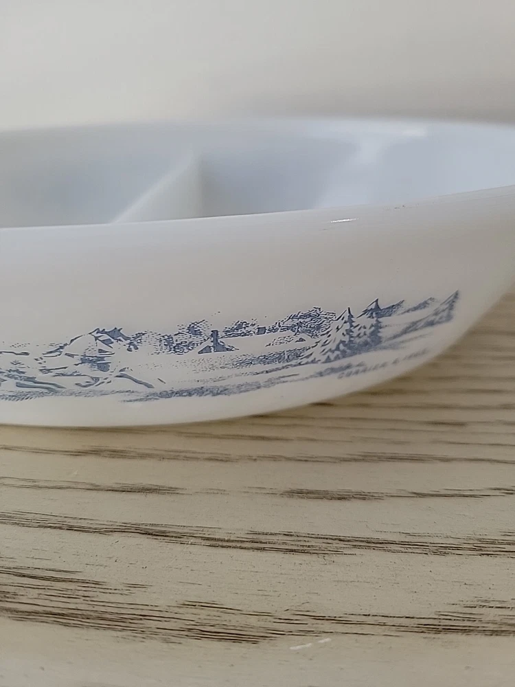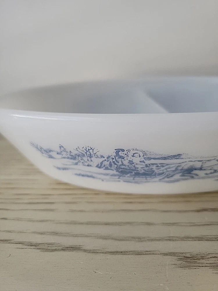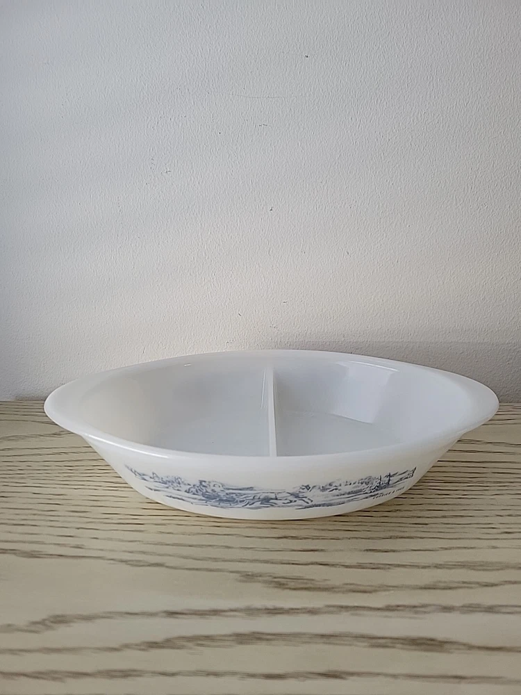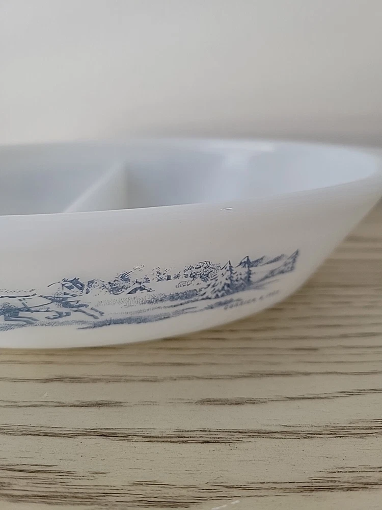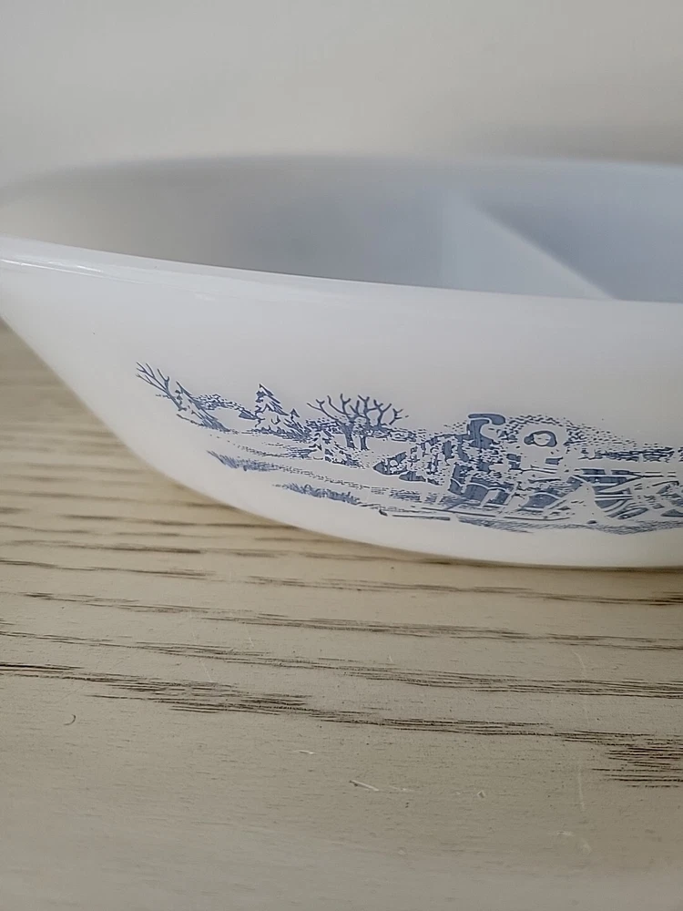 Glasbake Divided Casserole Dish Currier and Ives Blue White Glass Vintage Relish