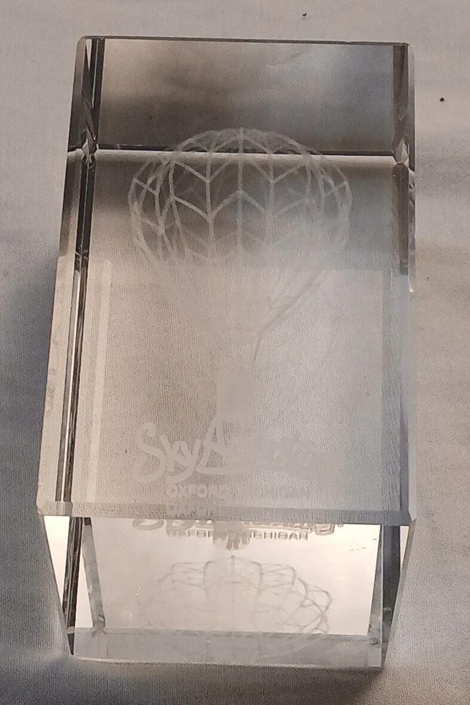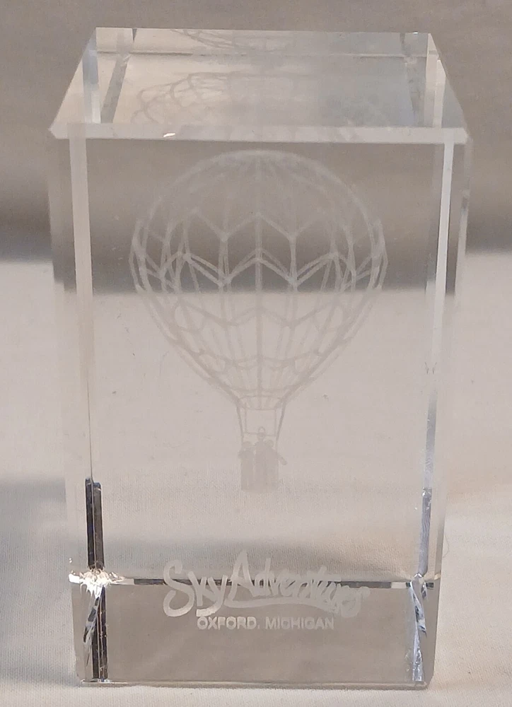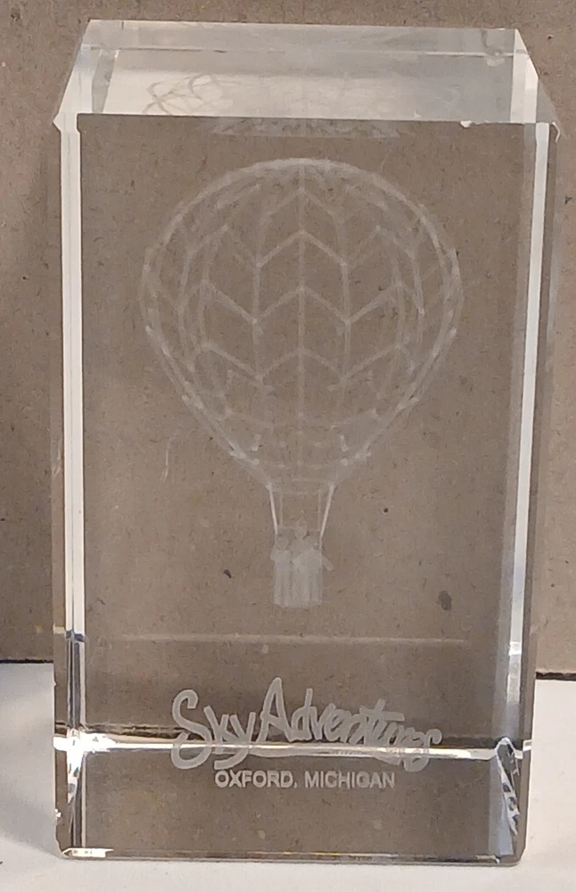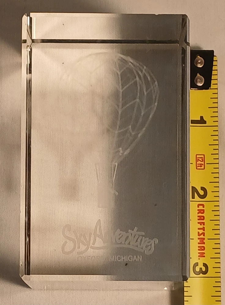 This item is pre-owned with no damages chips or cracks. You receive the same item pictured, the tape measure is shown for size reference. Etched glass depicting a hot air balloon and says Sky Adventures Oxford, Michigan. Carefully packed and quickly shipped by the next business day