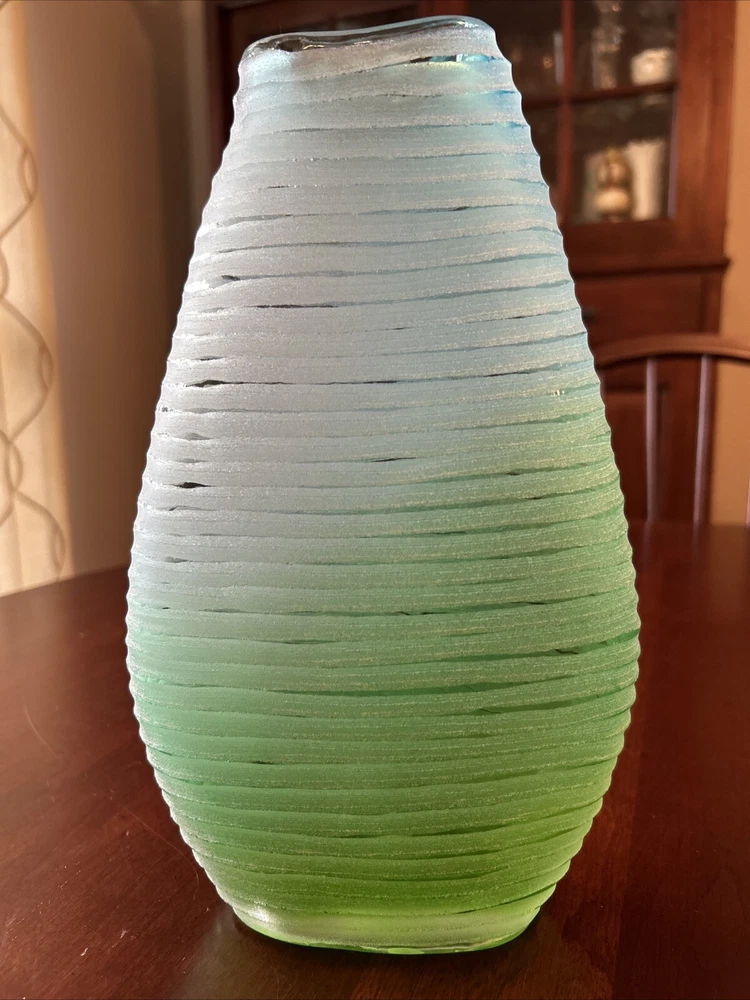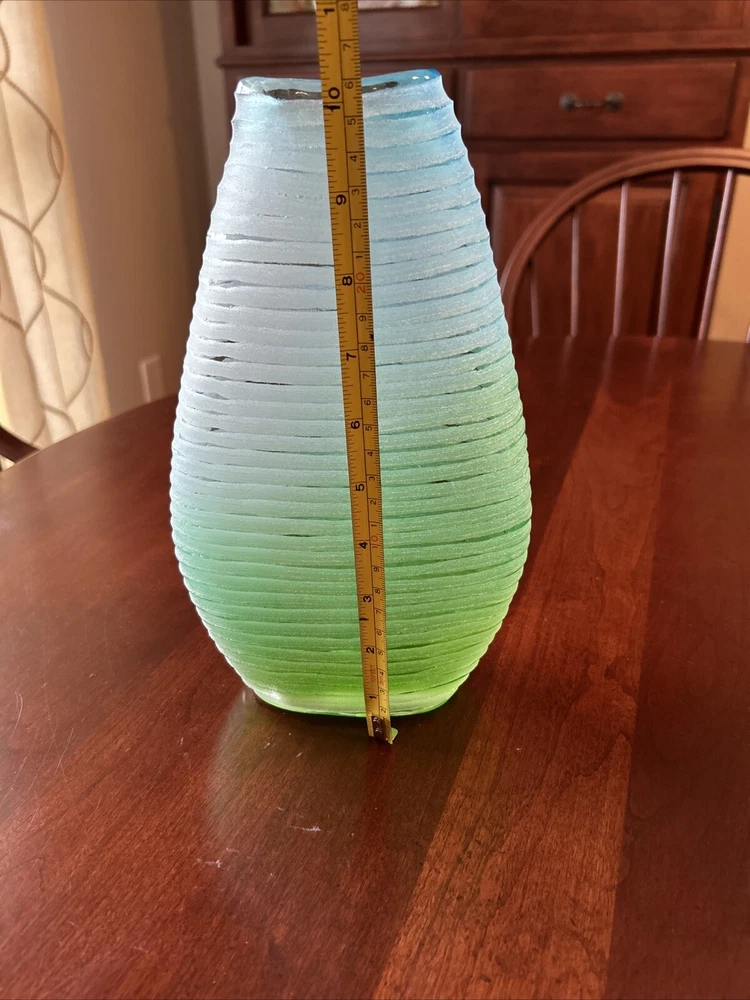 Crafted with attention to detail, this glass vase would be an attractive element to a beach themed space. Its layered glass pattern has an ombre effect, fading gracefully from a rich green to a serene blue. The frosted sandblasted finish adds a tactile dimension to the piece, making it a standout decorative item for any space. The vase stands 10.5 inches in height and measures 6 inches in width, providing a substantial and elegant canvas for your favorite blooms or as a standalone statement piece. This piece blends seamlessly with a variety of decor styles, bringing a touch of coastal charm to your home.