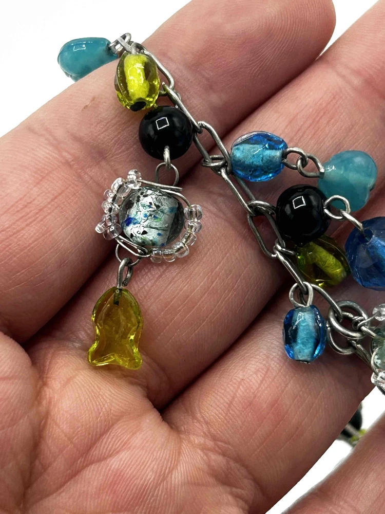 Glass Bead Multicolor Chain Link Lobster Clasp Charm Bracelet Add a splash of color to your wardrobe with this eye-catching bracelet featuring vibrant glass bead dangles and a charming chain link design, perfect for day or night. Its secure lobster clasp provides ease of wear while the playful fish accents add a whimsical touch. This piece is not only stylish but also versatile, making it an ideal accessory for any occasion. Condition: Good condition. Size: Features: Multicolor beads, Chain link, Lobster clasp, Fish accents Brand: Type: Bracelet Style: Charm Color: Multicolor Material: Glass Measurements: See pictures. Keywords: Jewelry, Bracelet, Multicolor, Beads, Charm, LobsterClasp, FishAccents, Accessory, Handmade, Fashion, Women, ArmCandy, Unique, Bohemian, Casual