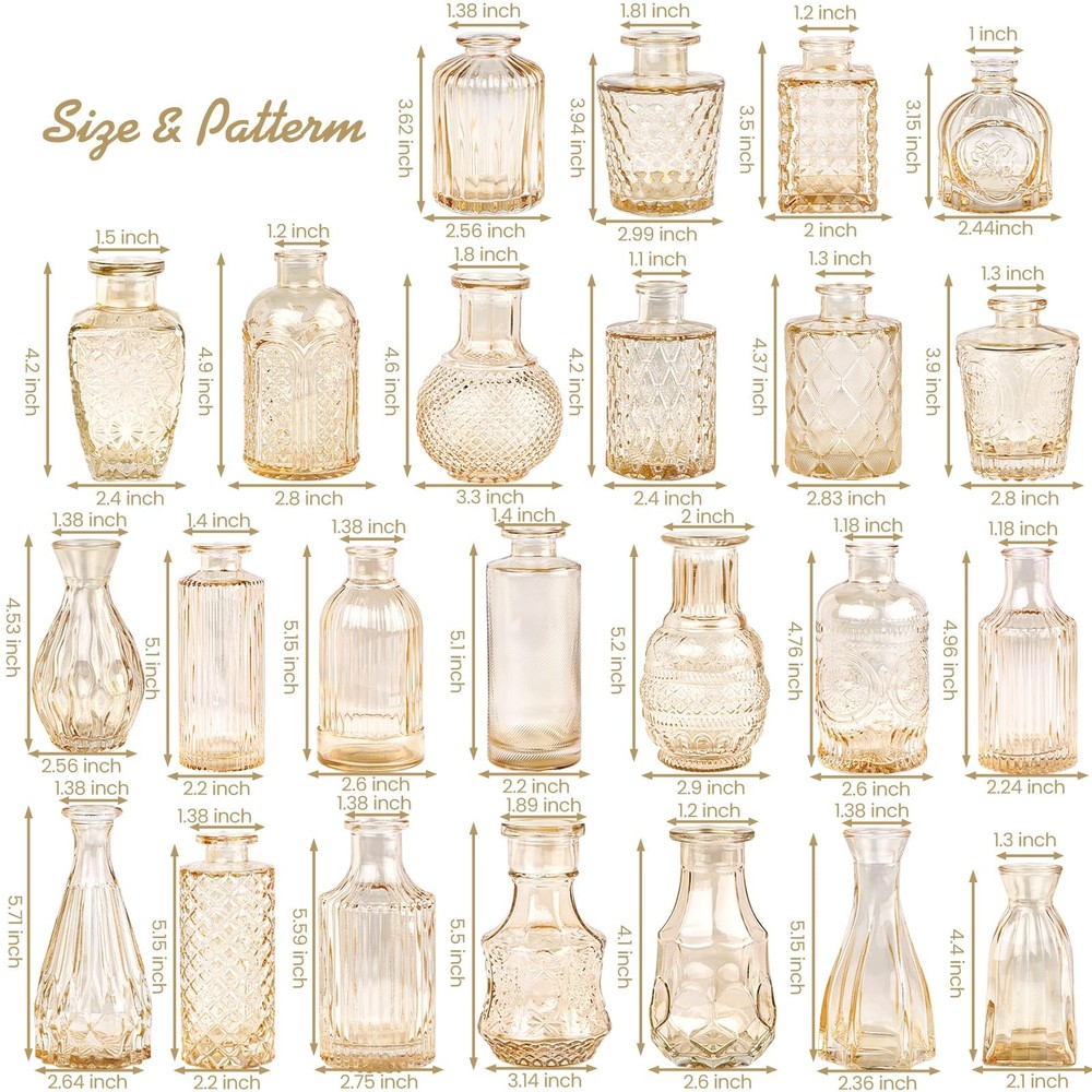 The glass vases for centerpieces are decorated with etching patterns, look retro and elegant; The unique design and adorable shape make these small vases be a impressive gift for family or friends, suitable for kinds of occasion Such as Christmas Decorations, Wedding Decorations For Reception, Housewarming, Birthday, Mothers Day, Valentine's Day or Restaurant Table; 【 Vintage Style 】small flower bud vases set of 24 ,each amber glass vase is decorated with etched patterns to further enhance its attractiveness. The different desgin mini vase is pleasant to the eyes even without flowers. Whether you're aiming for a minimalist look or a more elaborate arrangement, these different desgin mini vases provide the perfect foundation for your creative ideas. 【 Decorative Centerpiece 】An amber bud Vase is a captivating and elegant decorative piece designed, the combination of classic charm and a soothing amber hue makes the vase a delightful addition to any space. These blue small vases are designed to hold a small flower buds, dried flowers, or reed diffuser sticks, making them particularly popular for various occasions such as weddings, parties, and home decor. 【Thick & Sturdy Glass】Our amber glass vases for flowers are made of thick and strong glass, which is durable and not easily broken. The textured pattern on the surface adds a unique touch, creating an interesting visual element that catches and reflects light beautifully. These vases allow you to admire the natural beauty of each flower and garden cutting, adding a touch of elegance and beauty to your home. 【 Sturdy Packaging 】Your satisfaction is our priority! To ensure these mini vases reach you in perfect condition, our packaging is specially made for these pretty mini vases, all glass vases are safely packed in specially customized Styrofoam and thick cardboard boxes to avoid breakage during shipping. In the unlikely event that you receive a broken vase, we will exchange it for a new one or refund to you. 【 Wonderful Gift 】 The amber bud vases come in a variety of shapes, sizes, and materials, allowing you to choose the perfect one to complement your personal style and interior design. Furthermore, these mini vases for your own or send it as a gift on Anniversaries, Birthdays, Weddings, Housewarmings, Thanksgiving,Christmas New Year to create beautiful memories.