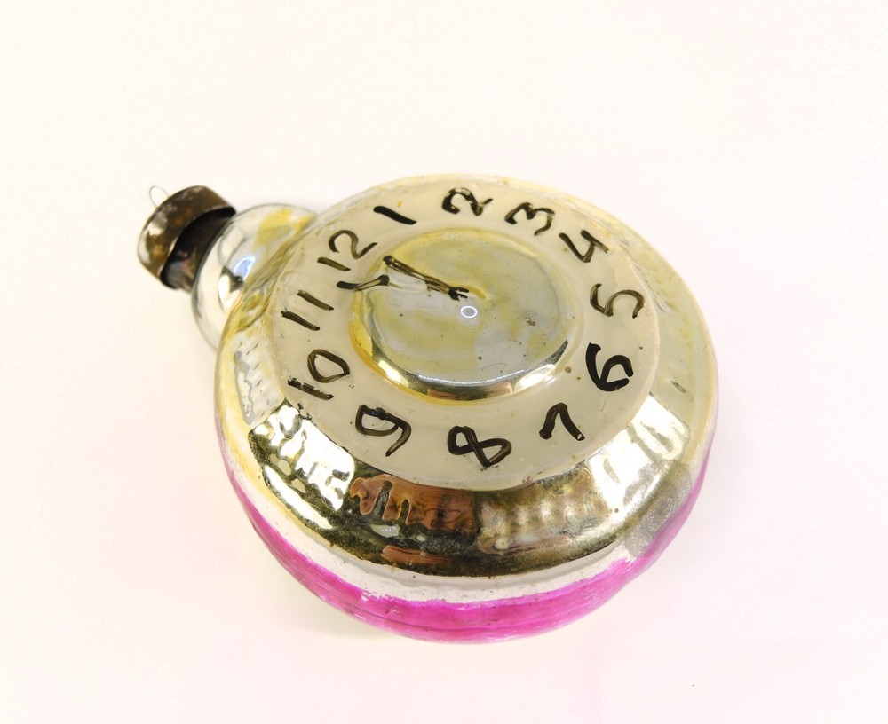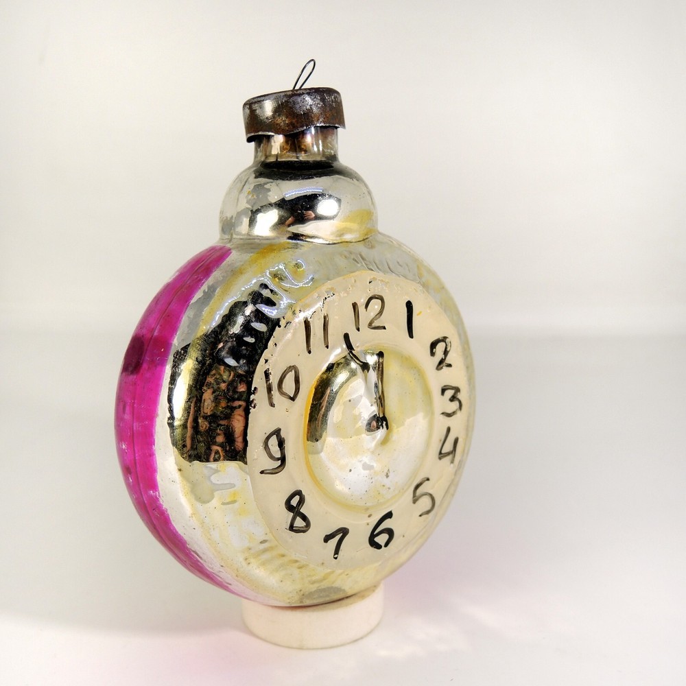 Beautiful vintage glass Christmas ornament. Big glass hand painting clock. New Year's watch. Made in USSR in 1960s-1970s. Great collectibles item. Look carefully photo - good condition for this age. The ball is whole. Thick glass. Diameter 8.6 cm. Height - 11 cm. t20